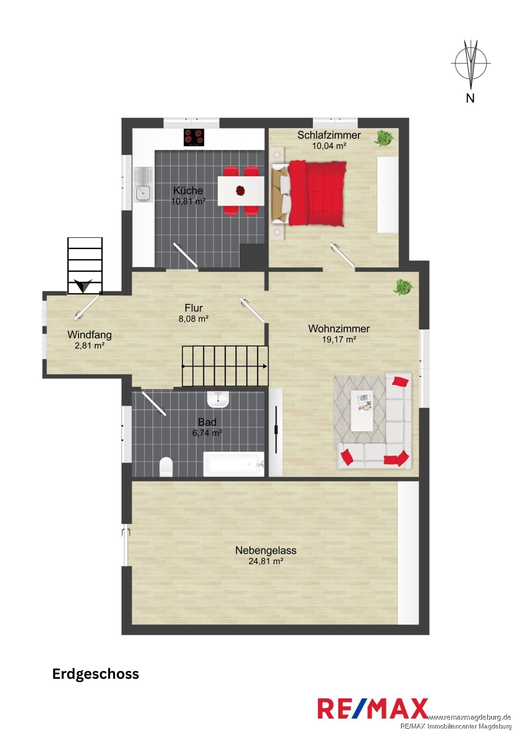 Erdgeschoss: Windfang, Flur, Küche, Tageslichtbad mit Wanne, Wohnzimmer, Schlafzimmer,