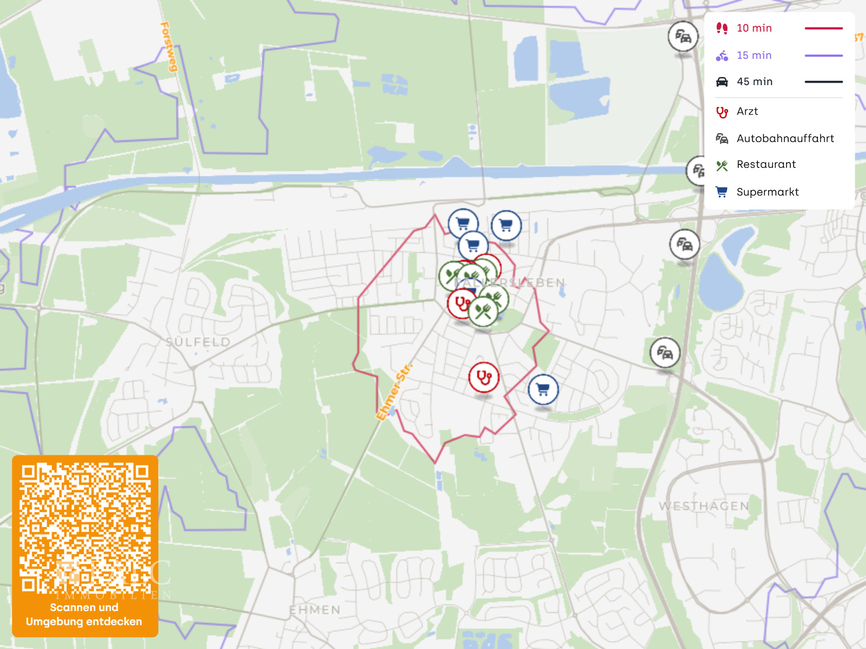 Hier wollen und werden Sie zukünftig gerne wohnen. Diese Lebensvorzüge sind kombiniert mit einer guten Nahverkehrsanbindung mit Bus oder Bahn sowie kurzen Wegen mit dem Auto z.B. zur A39 - oder mit dem Rad in der freien Natur!
