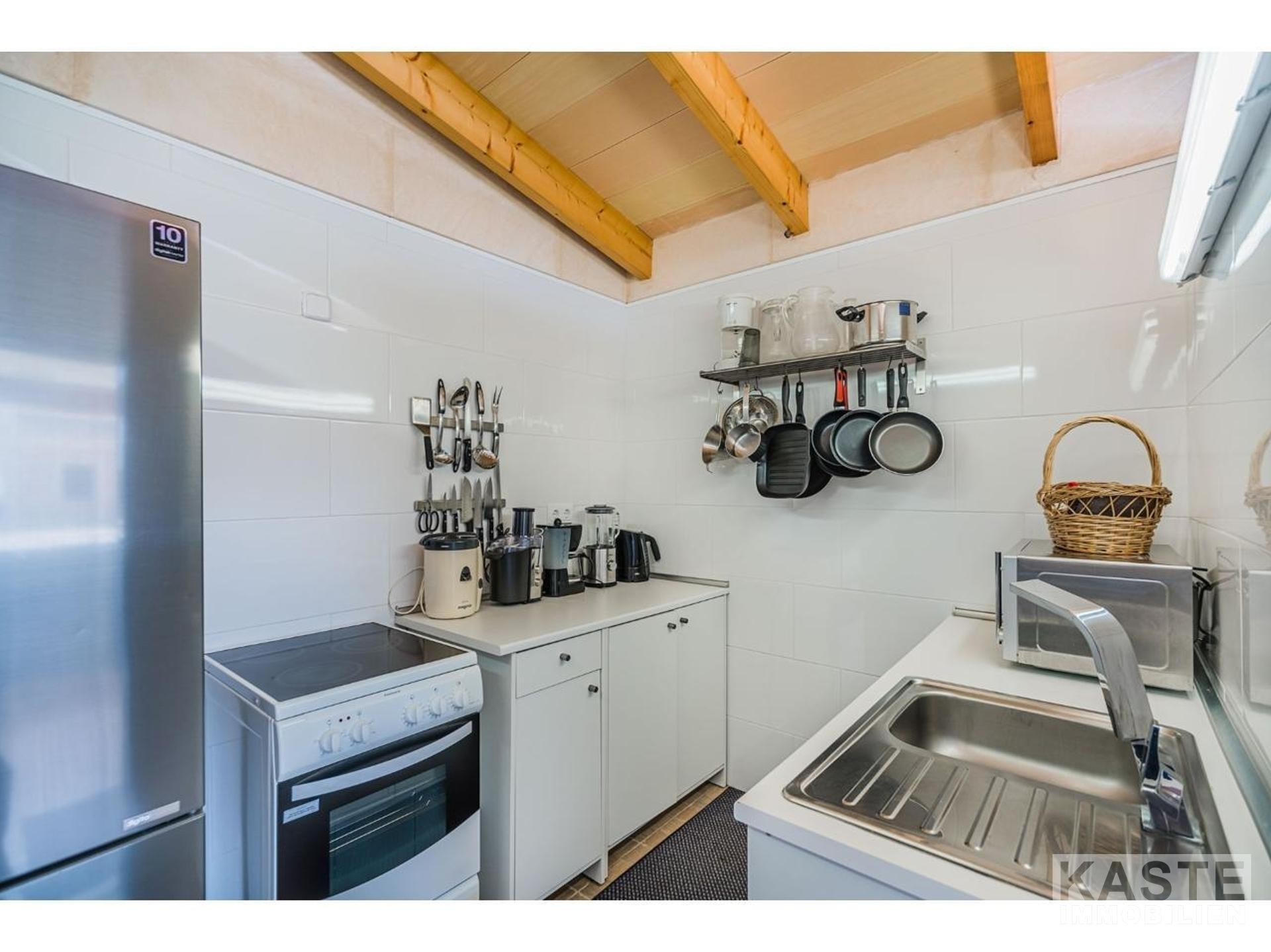 Die Immobilie wird durch eine große Eingangshalle mit Treppe zum ersten Stock betreten. Im Erdgeschoss befindet sich eine voll ausgestattete Küche, ein Esszimmer und ein geräumiges Wohnzimmer mit Zugang zur Pool-Terrasse. Auch die zwei Schlafzimmer auf dieser Etage haben Zugang zur Terrasse. Von den zwei Badezimmern ist eines en suite. Der Hauswirtschaftsraum und die Garage befinden sich ebenfalls im Erdgeschoss.