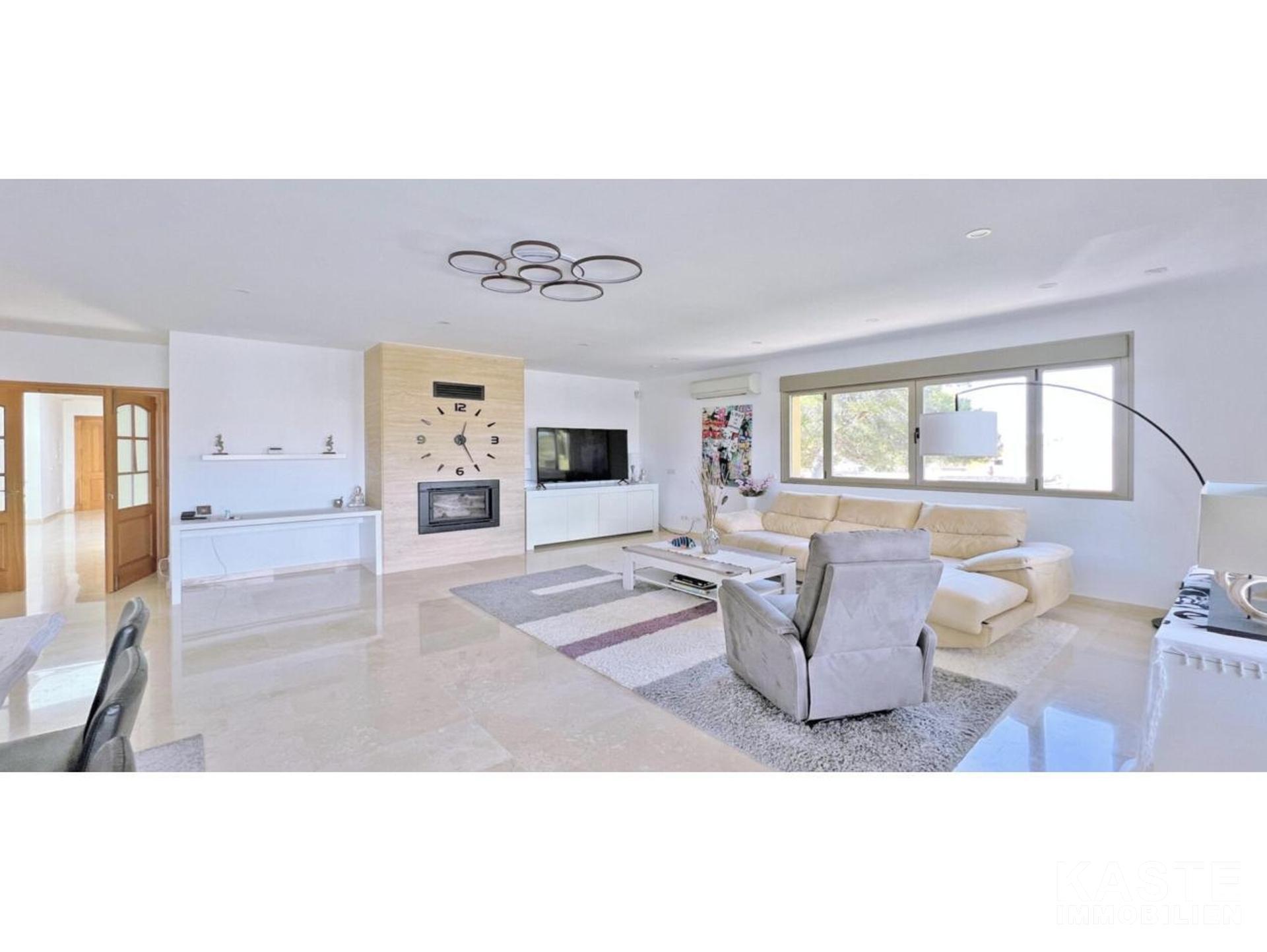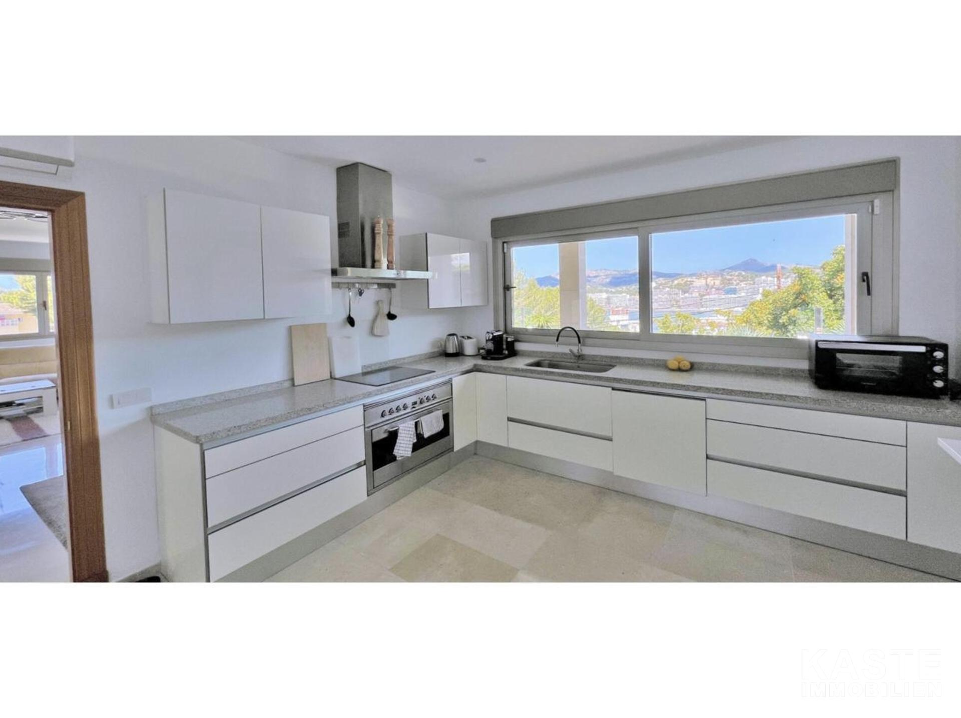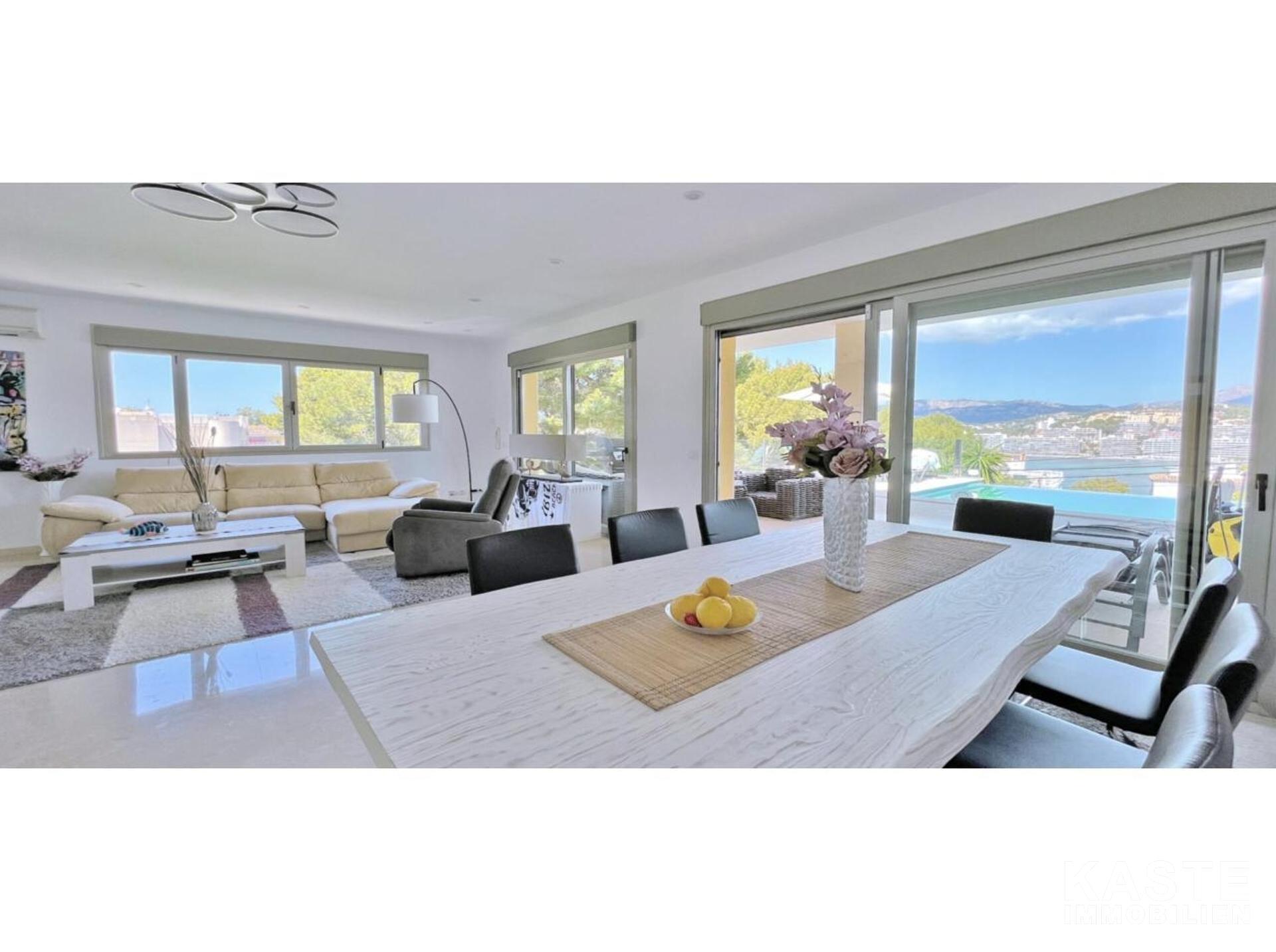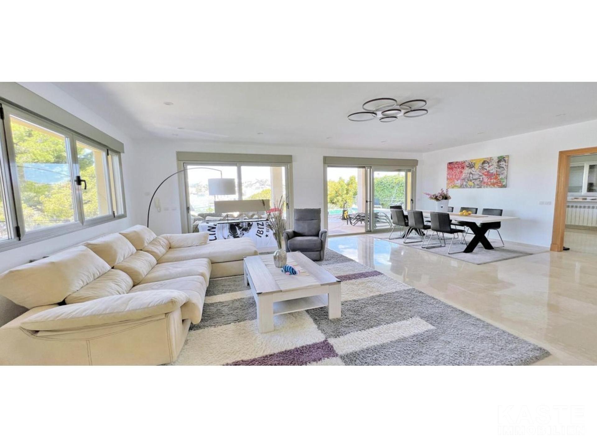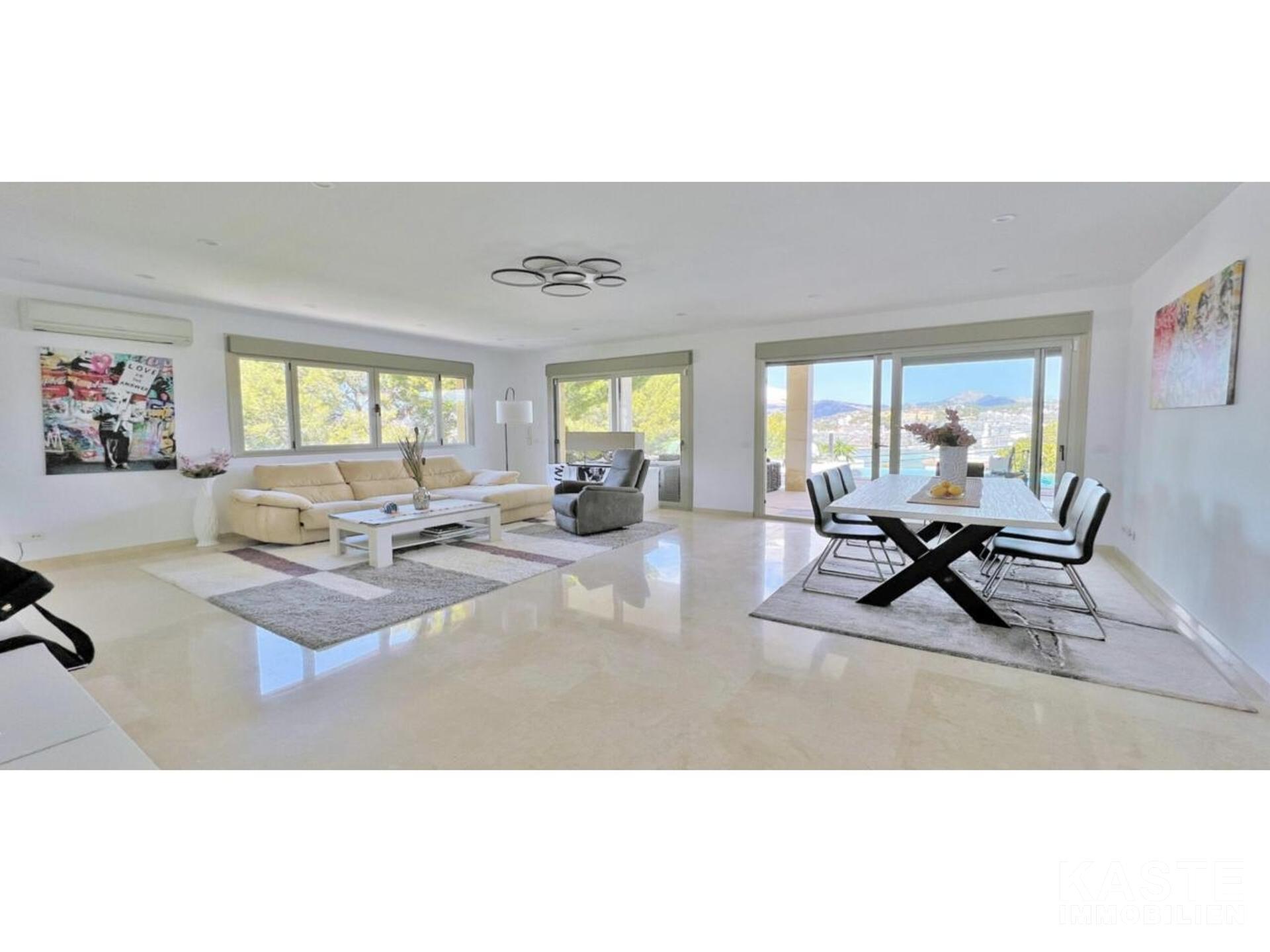 Die Villa besticht durch ein großzügiges Wohnzimmer, eine moderne Hightech-Einbauküche und eine weitläufige Terrasse, die einen atemberaubenden Blick auf das Meer und die umliegenden Berge bietet. Mit vier Schlafzimmern und vier Badezimmern bietet das Anwesen ausreichend Platz und Komfort.
