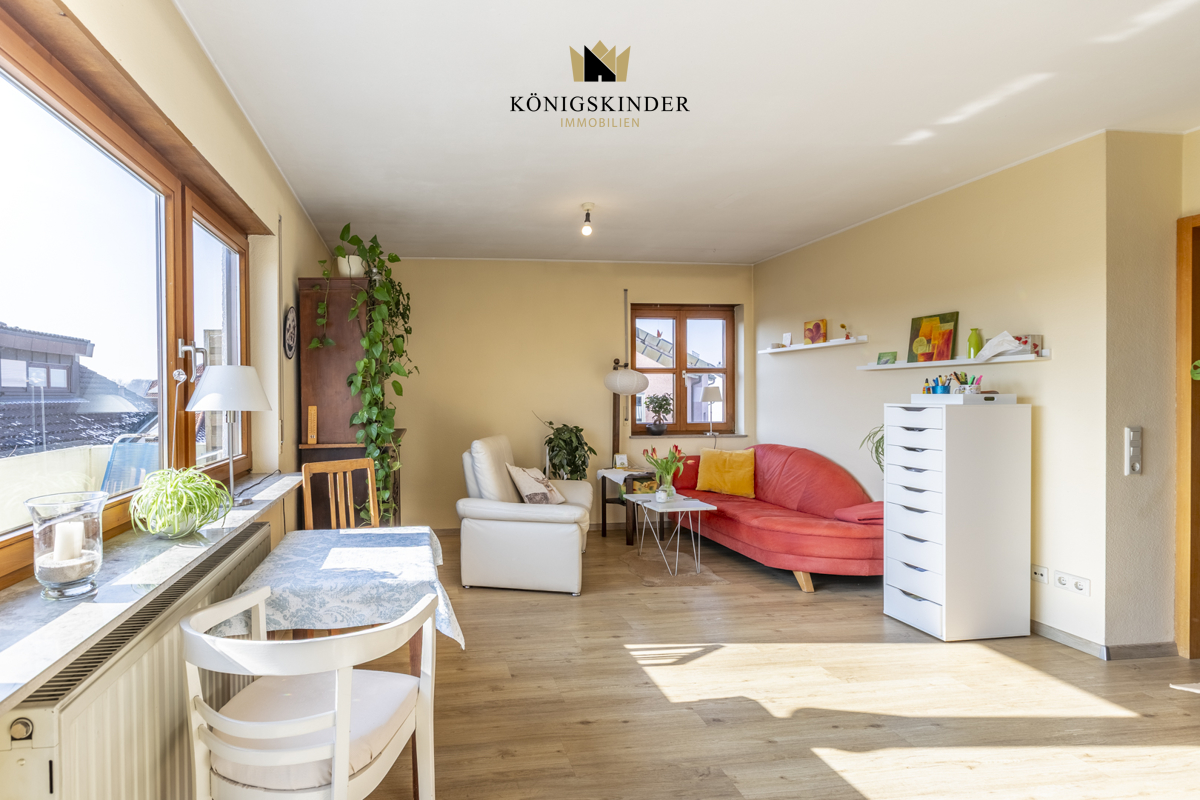 Der Wohn- und Essbereich bildet das Herzstück der Wohnung. Dank der offenen Gestaltung entsteht ein großzügiges Raumgefühl mit Platz für eine gemütliche Sofaecke, großzügigen Esstisch, TV-Wand und Schränke. Vom Wohnbereich aus gelangt man direkt auf den Balkon, der mit seiner angenehmen Größe zusätzlichen Wohnkomfort bietet. Hier lassen sich warme Sommerabende entspannt genießen – sei es bei einem Frühstück in der Morgensonne oder einem Glas Wein am Abend. Der freie Blick ins Grüne und auf einen gepflegten Nachbarsgarten macht diesen Außenbereich besonders reizvoll.