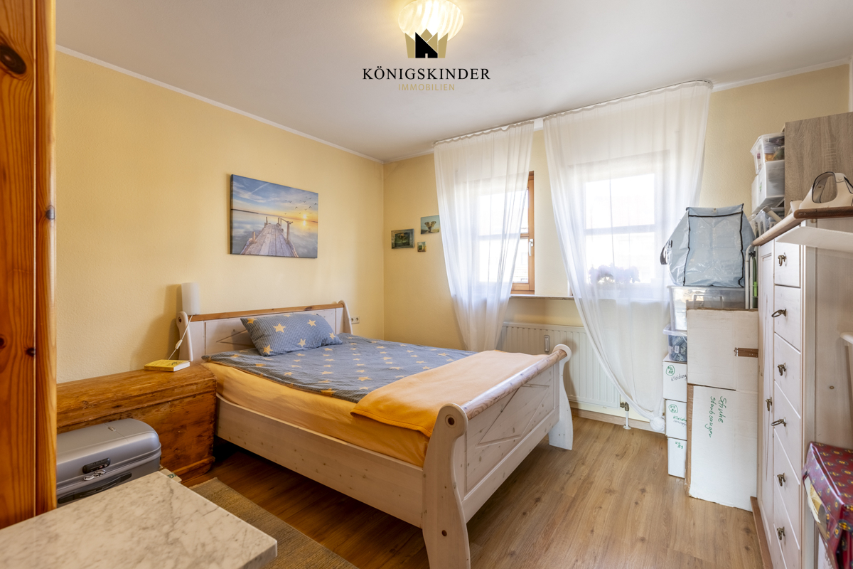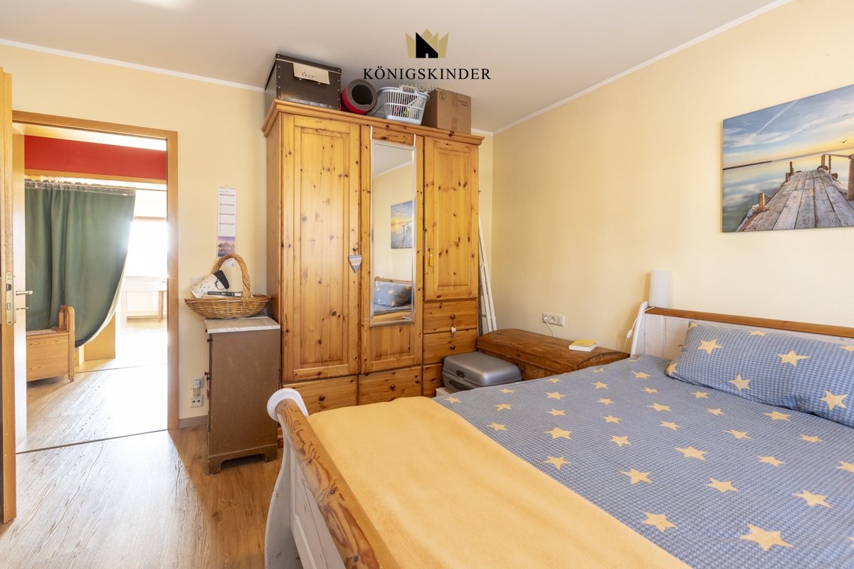 Das Schlafzimmer ist durch zwei große Fenster lichtdurchflutet und bietet Platz für ein großes Doppelbett sowie einen geräumigen Kleiderschrank. Die angenehme Raumgröße sorgt für eine entspannte Atmosphäre.
