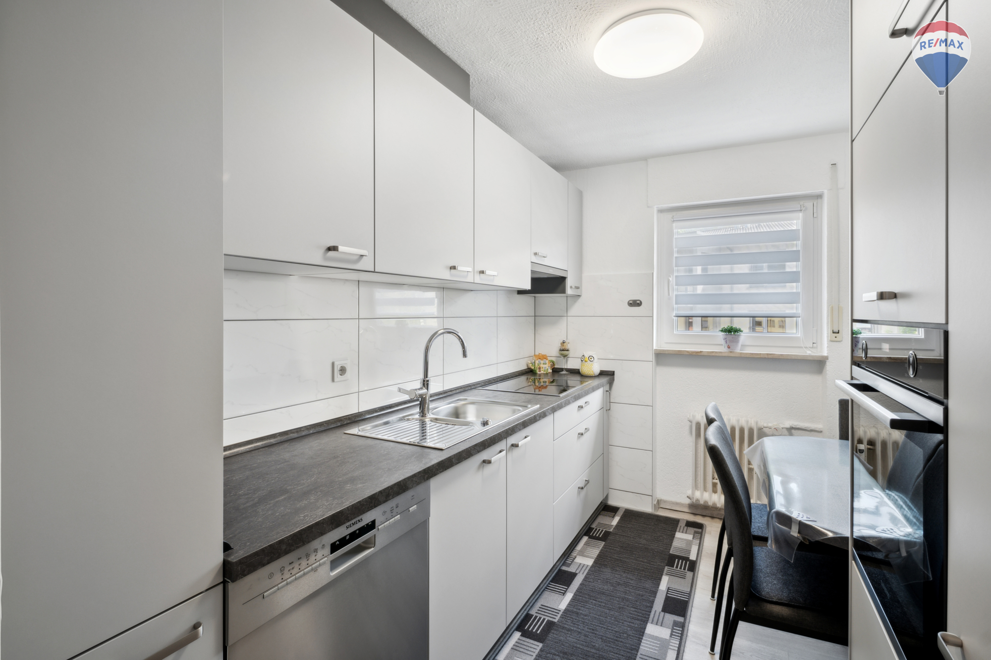 Das Wohnzimmer hat eine Fläche von ca. 25,65 m² und durch die großen Fenster und der Balkontüre wirkt sie sehr freundlich, hell und bietet eine Aussicht in die Natur und dem Spielplatz im grünen, das sich im Innenhof befindet. Die Küche ist nach Maß angefertigt und kam erst vor ein paar Jahren neu hinzu. Elektrogeräte sind auf einem aktuellen Stand der Technik und diese wird in dem Preis mit verkauft. Ein Tisch mit 3 bis 4 Stühlen passen sehr gut rein und runden somit das Küchenzimmer perfekt ab.