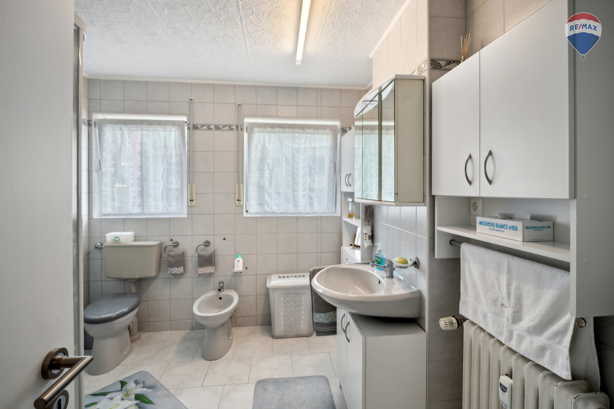 Das Badezimmer ist mit einem hellen Fliesenboden verlegt, einer Duschwanne, einem Bidet, einem Spiegelschrank mit Beleuchtung, einem Waschbeckenunterschrank und ist zusätzlich mit einem Heizkörper ausgestattet. Die Decke des Badezimmers wurde passend zu der Wohnung verschönert. Das Schlafzimmers ist ca. 15,20 m² groß und befindet sich jeweils neben dem Wohnzimmer und der Küche.