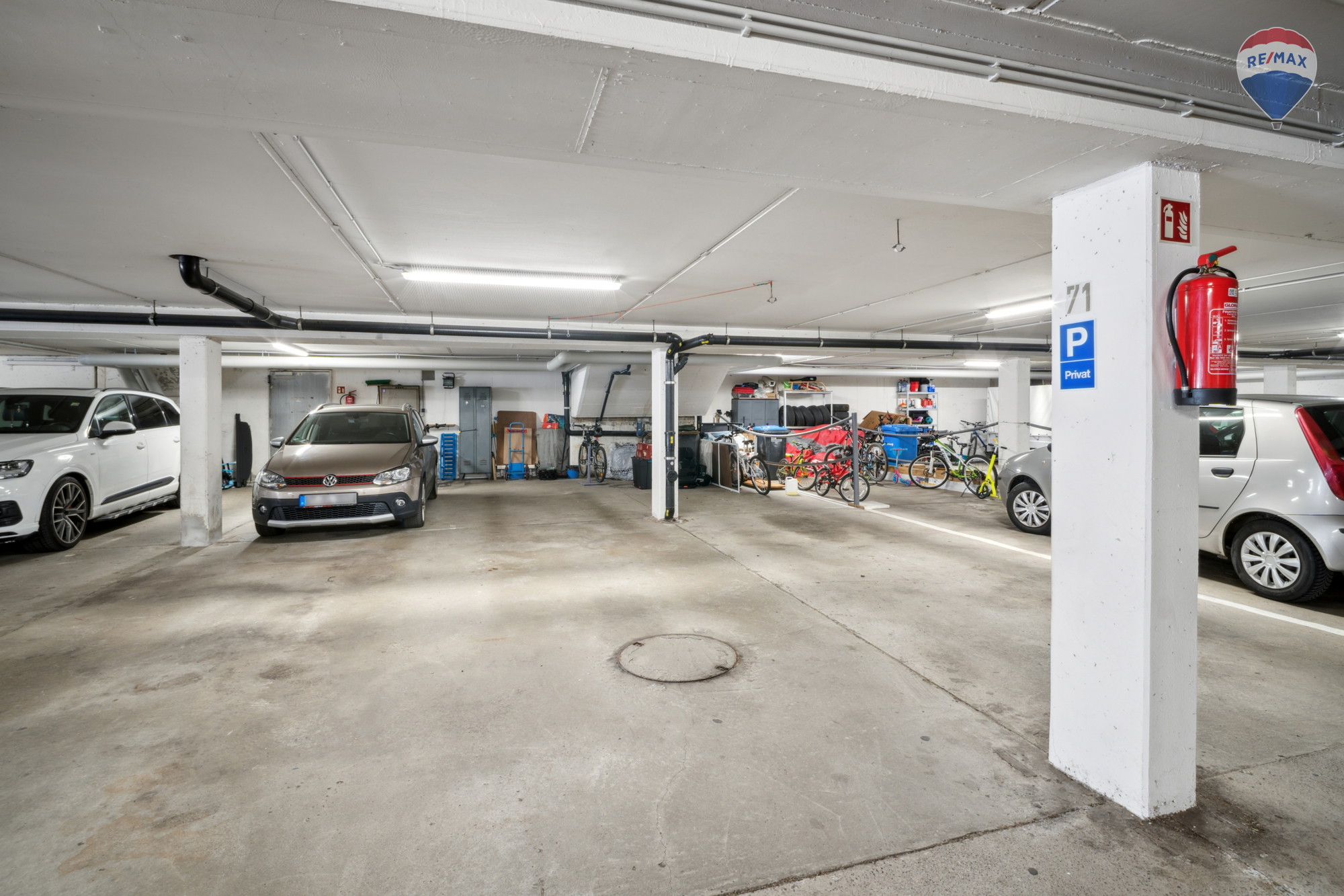 Zu der Wohnung gehören 2 Tiefgaragenstellplätze, diese sind hintereinander und die Tiefgarage wird rund um die Uhr mit 4 Kameras bewacht. Ein mittelgroßer Kellerzimmer, mit Sichtschutz gehören dazu (s. Bild, Keller).