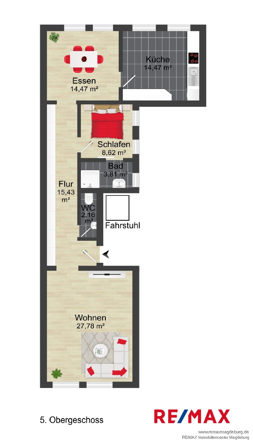 Die 3-R-Wohnung im 5.Obergeschoss ist wie folgt aufgeteilt: - Flur, - Wohnzimmer, - WC, - Schlafzimmer, - Bad mit Dusche, - Esszimmer, - Küche mit EBK.