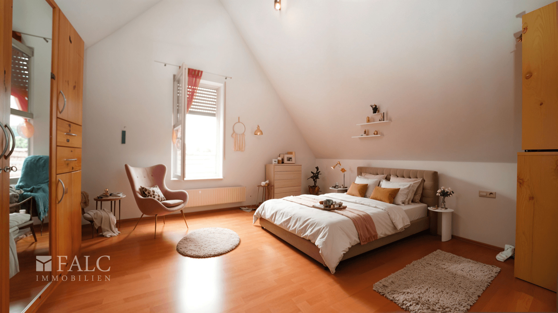 Die Wohnung verfügt über drei Zimmer, die flexibel genutzt werden können. Das ca. 17 m² große Elternschlafzimmer im Dachgeschoss bietet Privatsphäre und Ruhe. Ein weiteres Zimmer mit ca. 10 m² eignet sich hervorragend als Kinderzimmer oder Büro. Hochwertige Bodenbeläge aus Laminat und Fliesen verleihen den Räumen eine elegante Note.