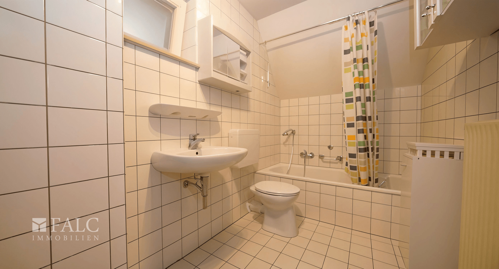 Das großzügige Badezimmer verfügt über ein WC, Waschbecken sowie eine Badewanne und bietet ausreichend Platz für eine Waschmaschine.