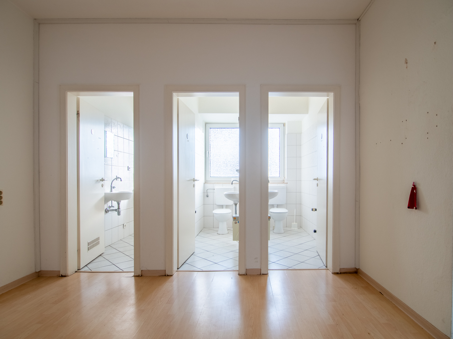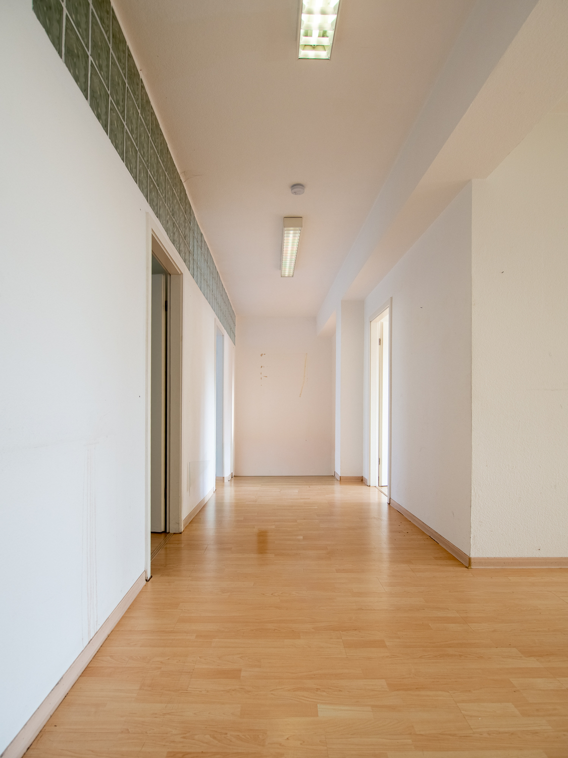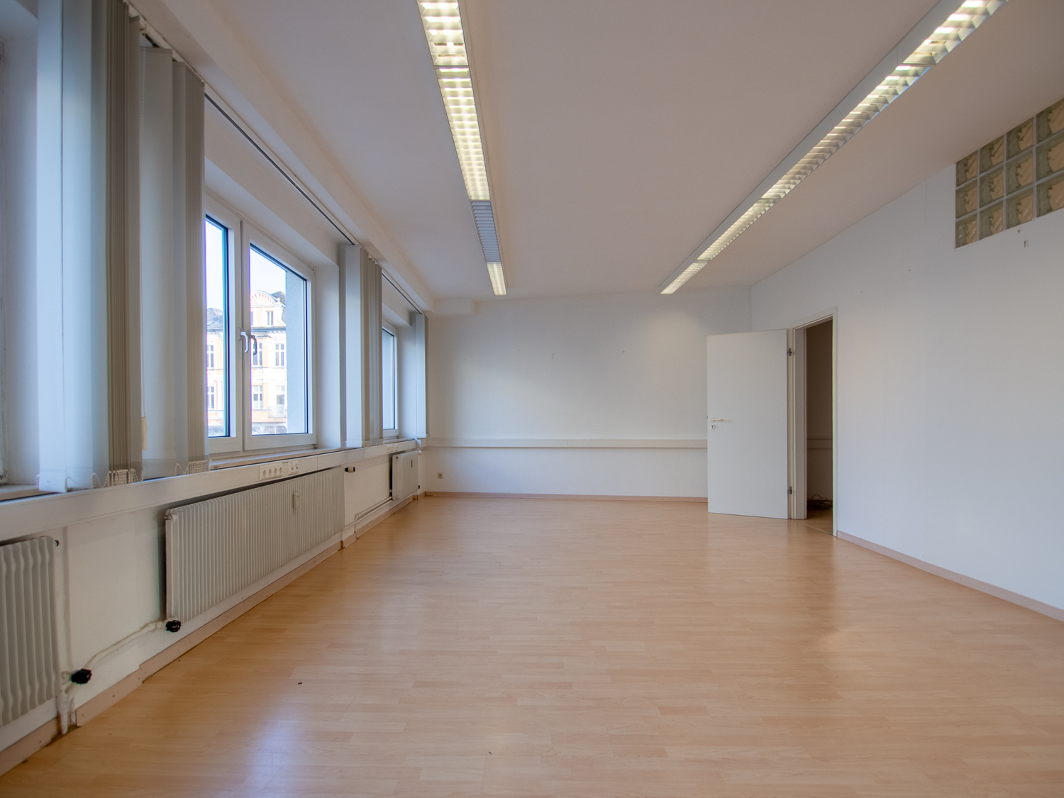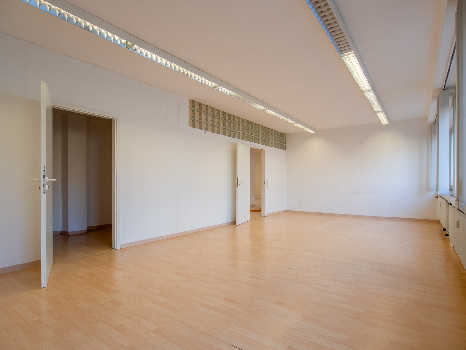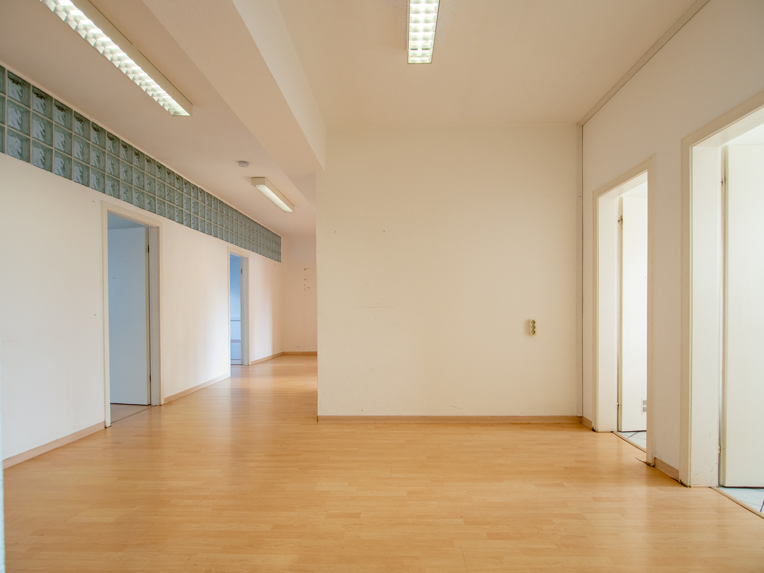 Die Bürofläche ist mit Laminatboden ausgestattet. Individuelle Veränderungen und Anpassungen der Raumaufteilung oder Ausstattung können nach Absprache vorgenommen werden, wodurch sich die Fläche flexibel an unterschiedliche Nutzungsanforderungen anpassen lässt.