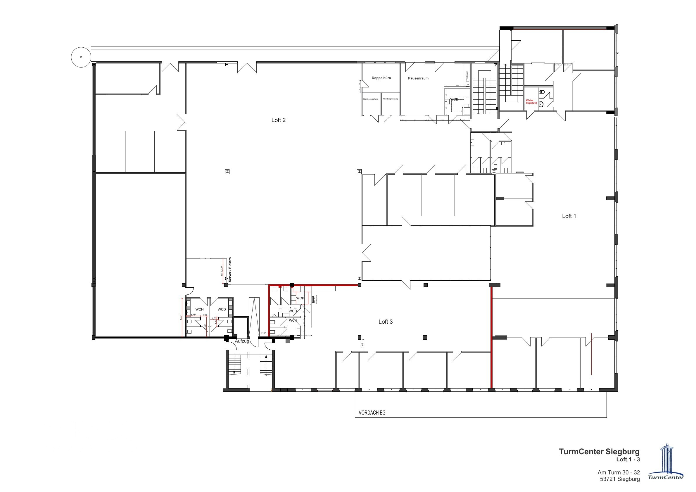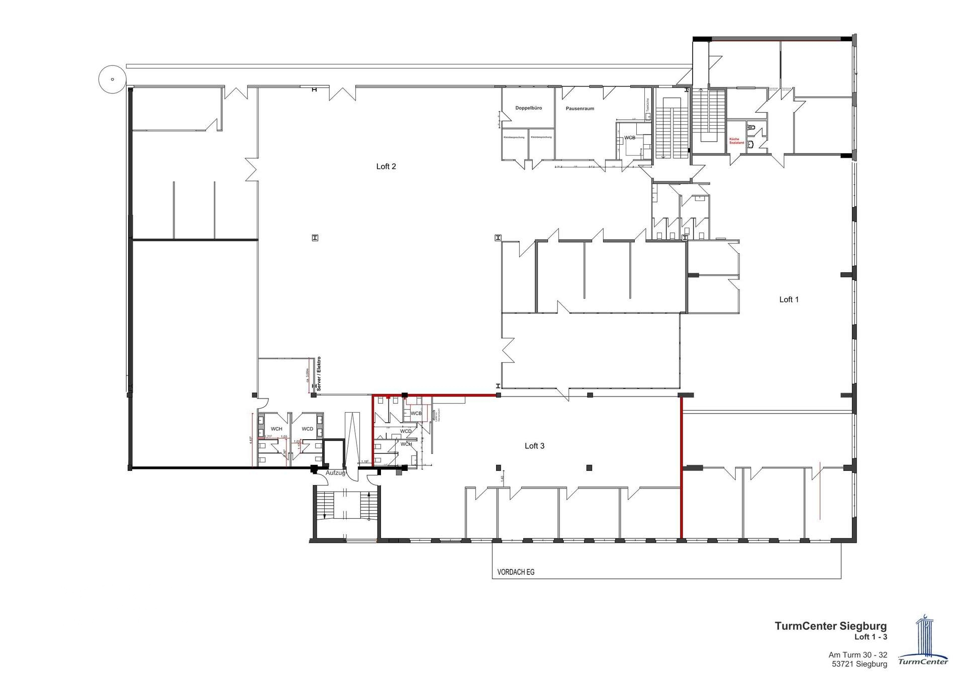 Loft 1 verfügt über mehrere Einzelbüros, Besprechungsräume, eine Teeküche, ein Doppelbüro sowie sanitäre Anlagen. Die Fläche ist auf klassische Bürokonzepte mit abgeschlossenen Arbeitsbereichen ausgerichtet. Loft 2 bietet eine offene Grundstruktur mit direktem Zugang zu einem Pausenraum und gemeinschaftlichen WC-Anlagen. Diese Einheit ist für offene Arbeitsformen wie Agenturen oder Coworking geeignet. Loft 3 kombiniert offene Flächen mit Einzelbüros und ist direkt vom Haupteingang erreichbar. Auch hier sind separate WC-Anlagen vorhanden, wodurch eine eigenständige Nutzung möglich ist.