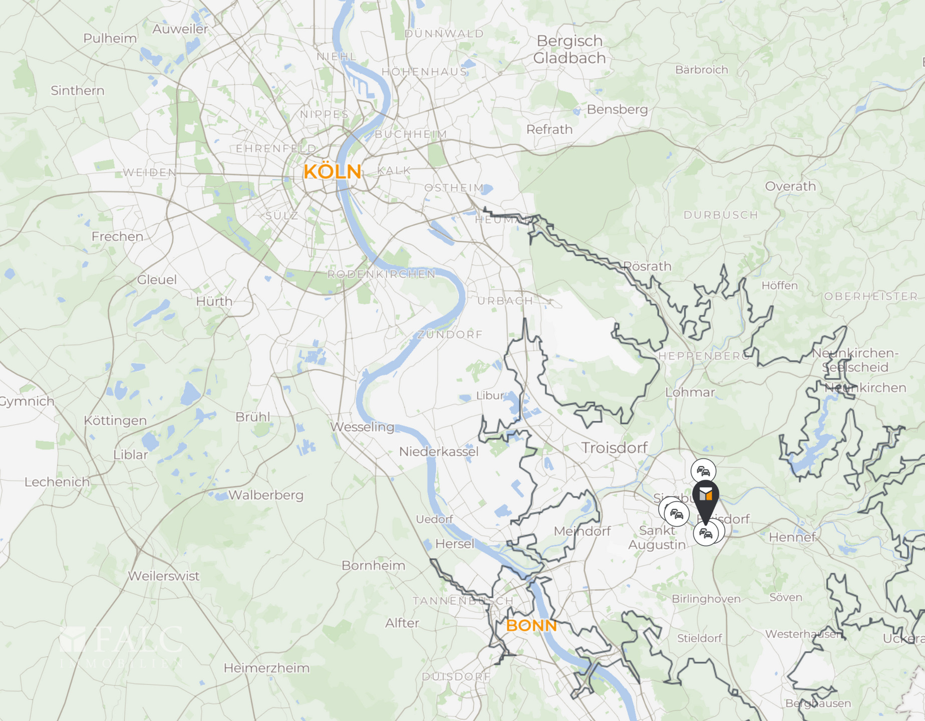 Der öffentliche Nahverkehr ist ebenfalls gut erschlossen, mit einer Anbindung in ca. 1 km Entfernung. Dies erleichtert nicht nur den täglichen Arbeitsweg für Mitarbeiter, sondern auch den Zugang für Kunden und Geschäftspartner. Die Nähe zum Flughafen Köln/Bonn, der in ca. 20 km erreichbar ist, bietet zudem eine ausgezeichnete Anbindung für nationale und internationale Geschäftsreisen.