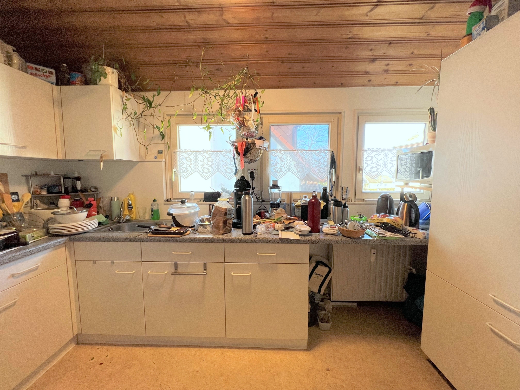 Die separate Küche bietet alles für den Alltag und ist funktional ausgestattet – ideal für kompakte Lebensstile. Das Schlafzimmer bietet, trotz dem Dachschräge, ausreichend Platz.