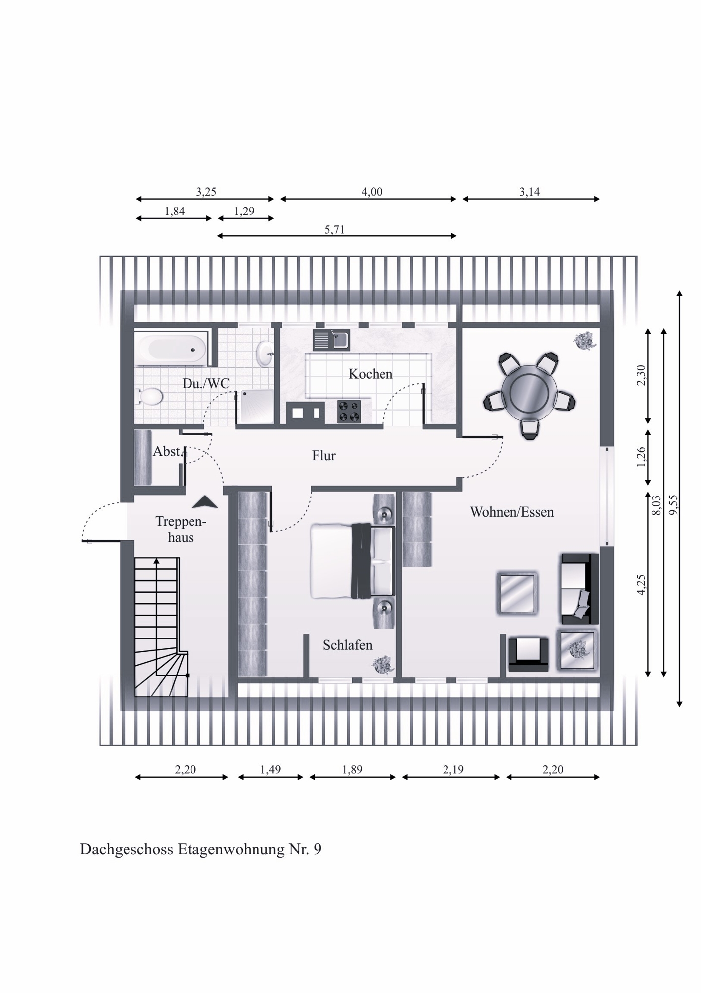 Diese Wohnung im Dachgeschoss mit ca. 66 m² Wohnfläche befindet sich in einem Mehrfamilienhaus, welches 1900 erbaut wurde. Das Dachgeschoss wurden jedoch erst 1990 ausgebaut. Diese Wohnung bietet zwei Zimmer, ein Badezimmer und eine Küche und ist modern gestaltet.