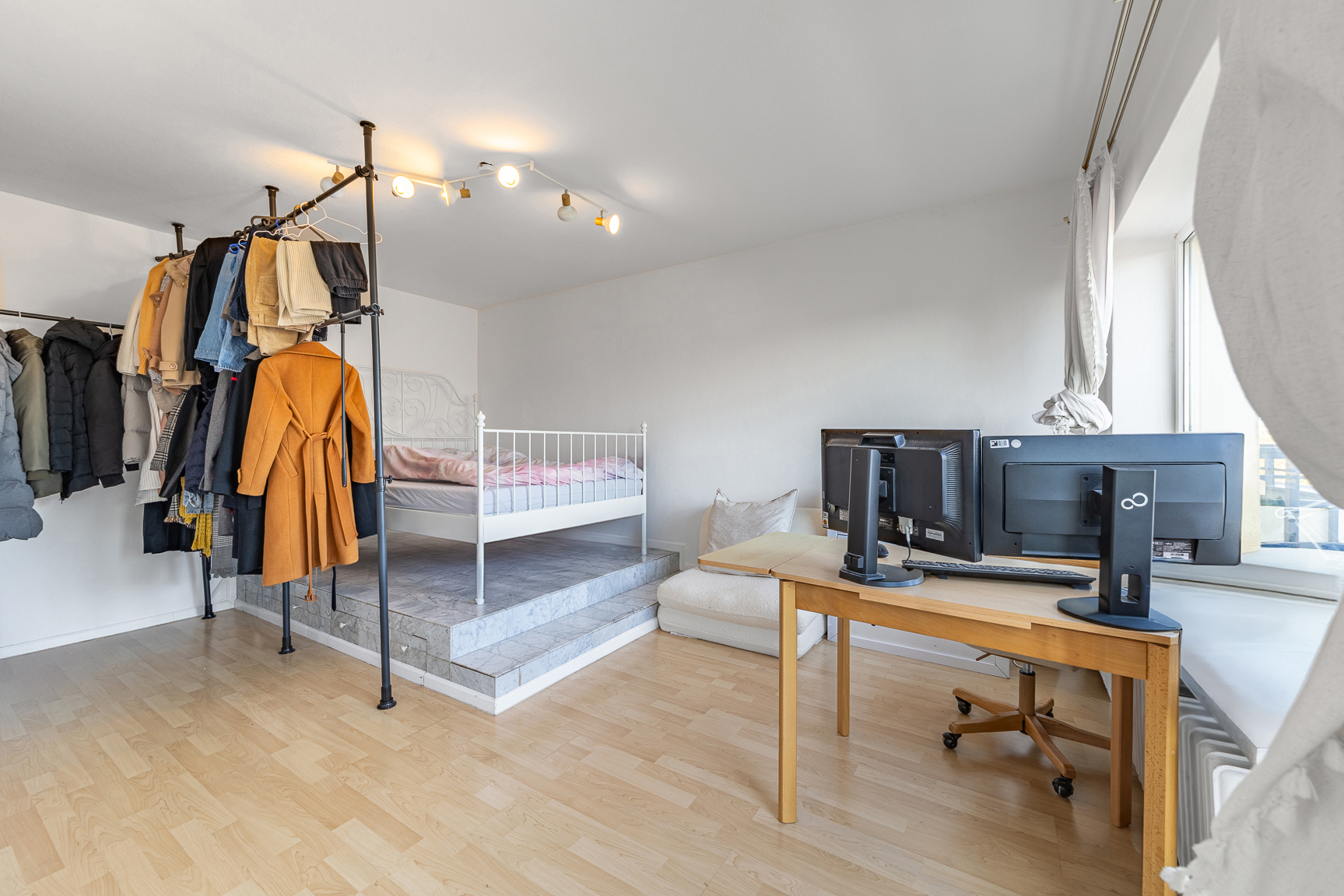 Die Wohnung liegt im 5. Obergeschoss eines Mehrfamilienhauses und ist bequem über den Aufzug erreichbar. Der Grundriss ist funktional gestaltet: Der kombinierte Wohn- und Schlafbereich bietet ausreichend Platz für eine komfortable Möblierung und wirkt dank großer Fensterflächen offen und freundlich.