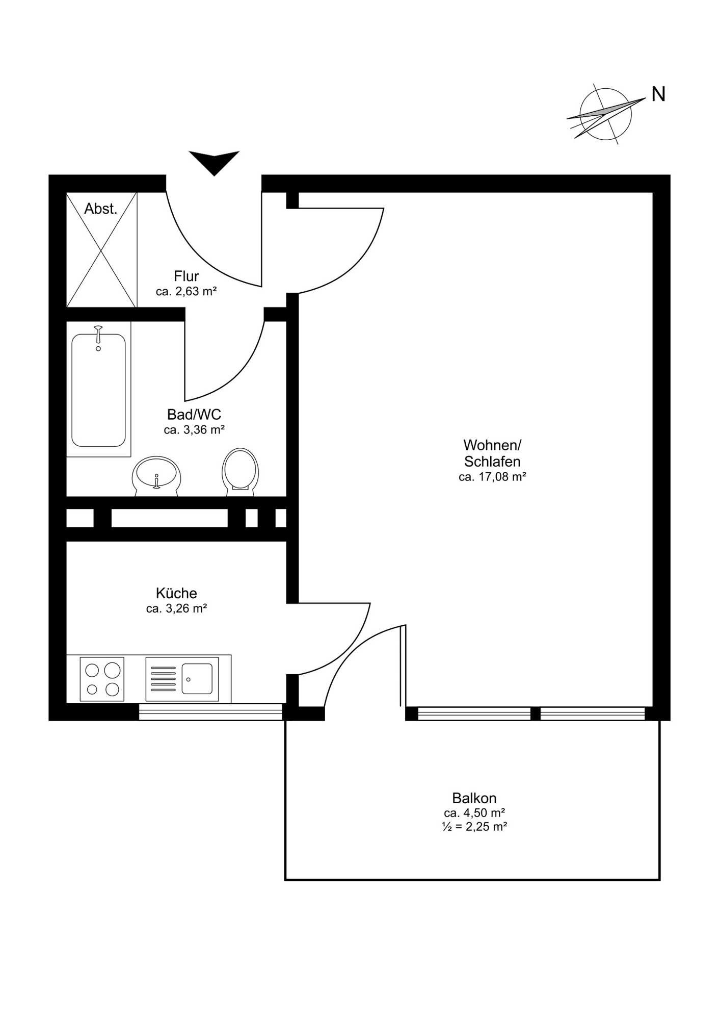 Besonders praktisch ist die separate Küchennische mit Fenster, die den Raum strukturiert und für ein angenehmes Wohngefühl sorgt. Die vorhandene Einbauküche ist gepflegt und zeitlos gestaltet – ideal für Singles, Studierende oder Pendler. Das Badezimmer ist klassisch ausgestattet und verfügt über eine Badewanne, ein Waschbecken sowie ein WC.