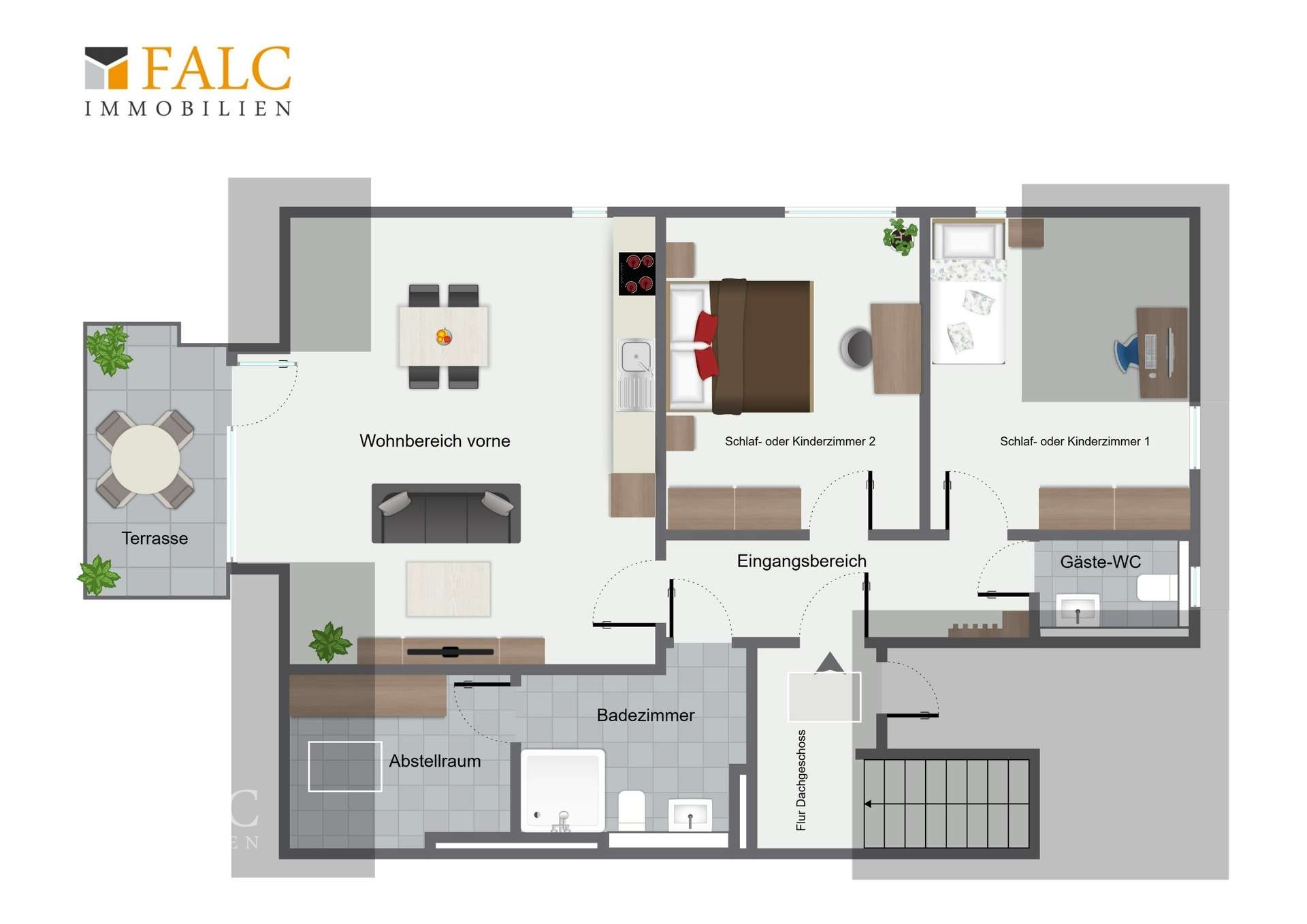 Großflächiger WohnbereichSo könnte es aussehenKinder- oder SchlafzimmerHell und offen SonnenterrasseEbenerdige Dusche Attraktive RaumgrößenWC für Ihre Gäste Platz für Waschmaschine und Trockner Willkommen Zuhause Hausansicht vorneGrundrissTitelbild
