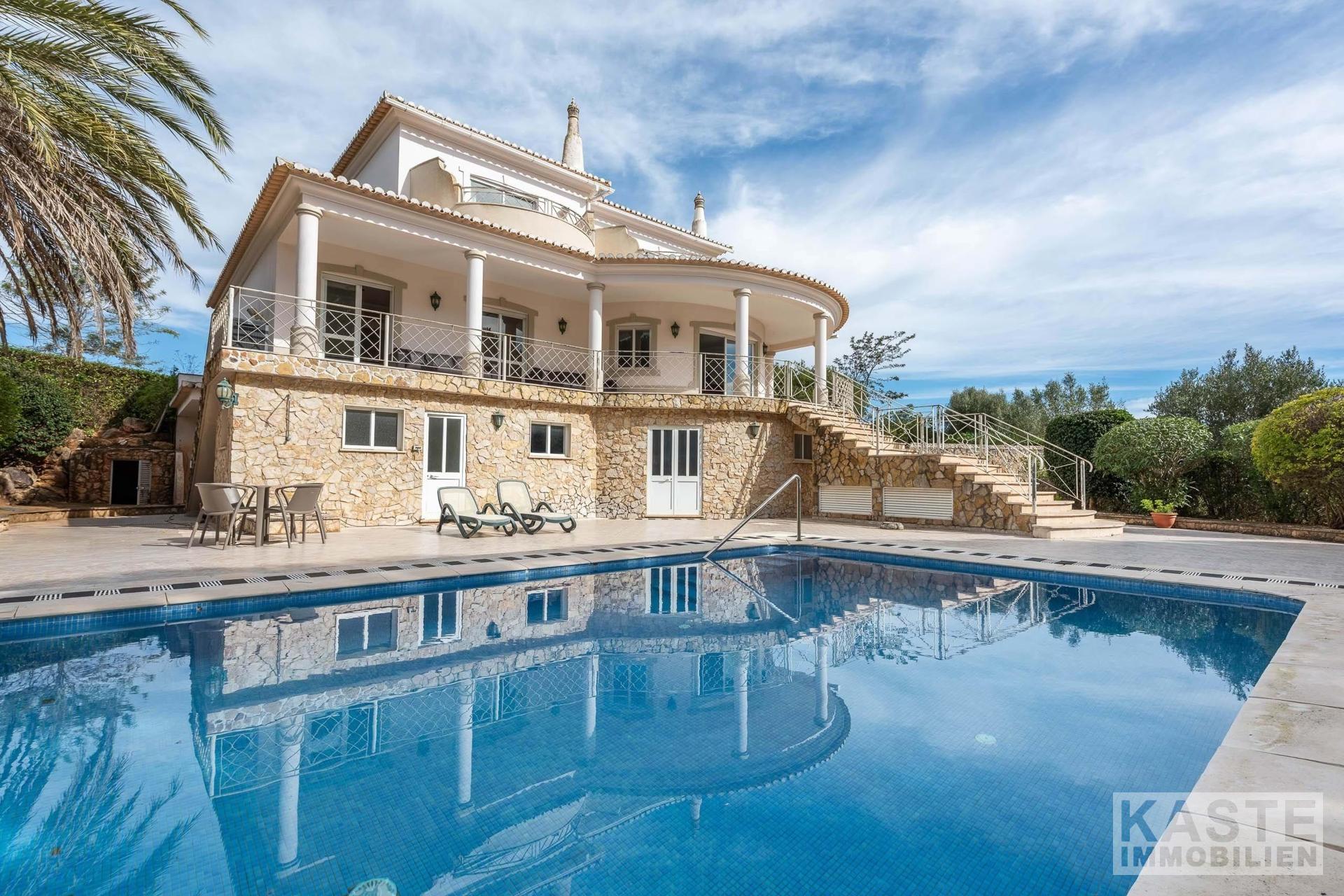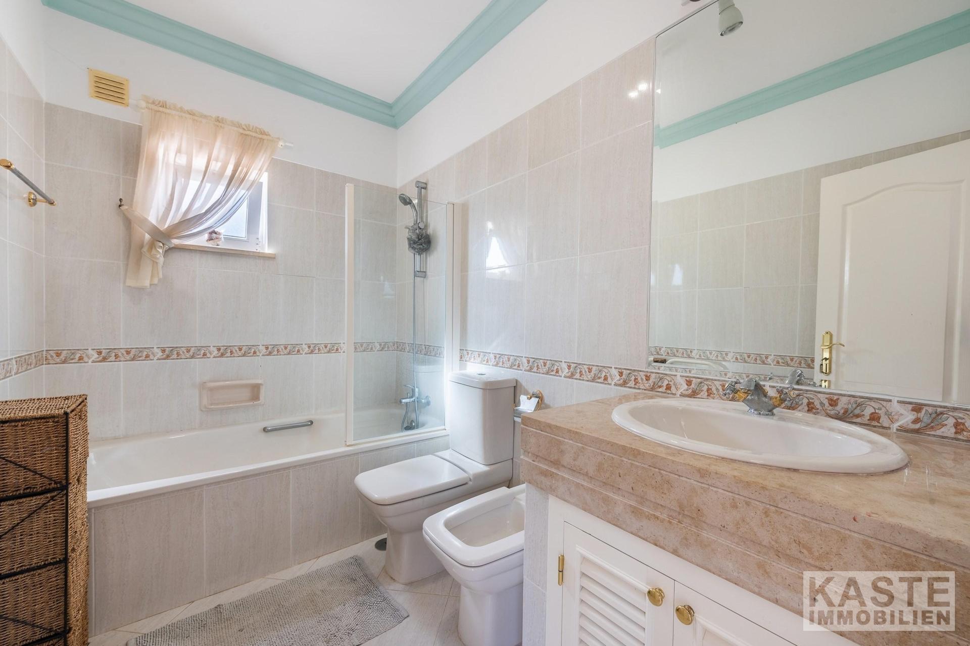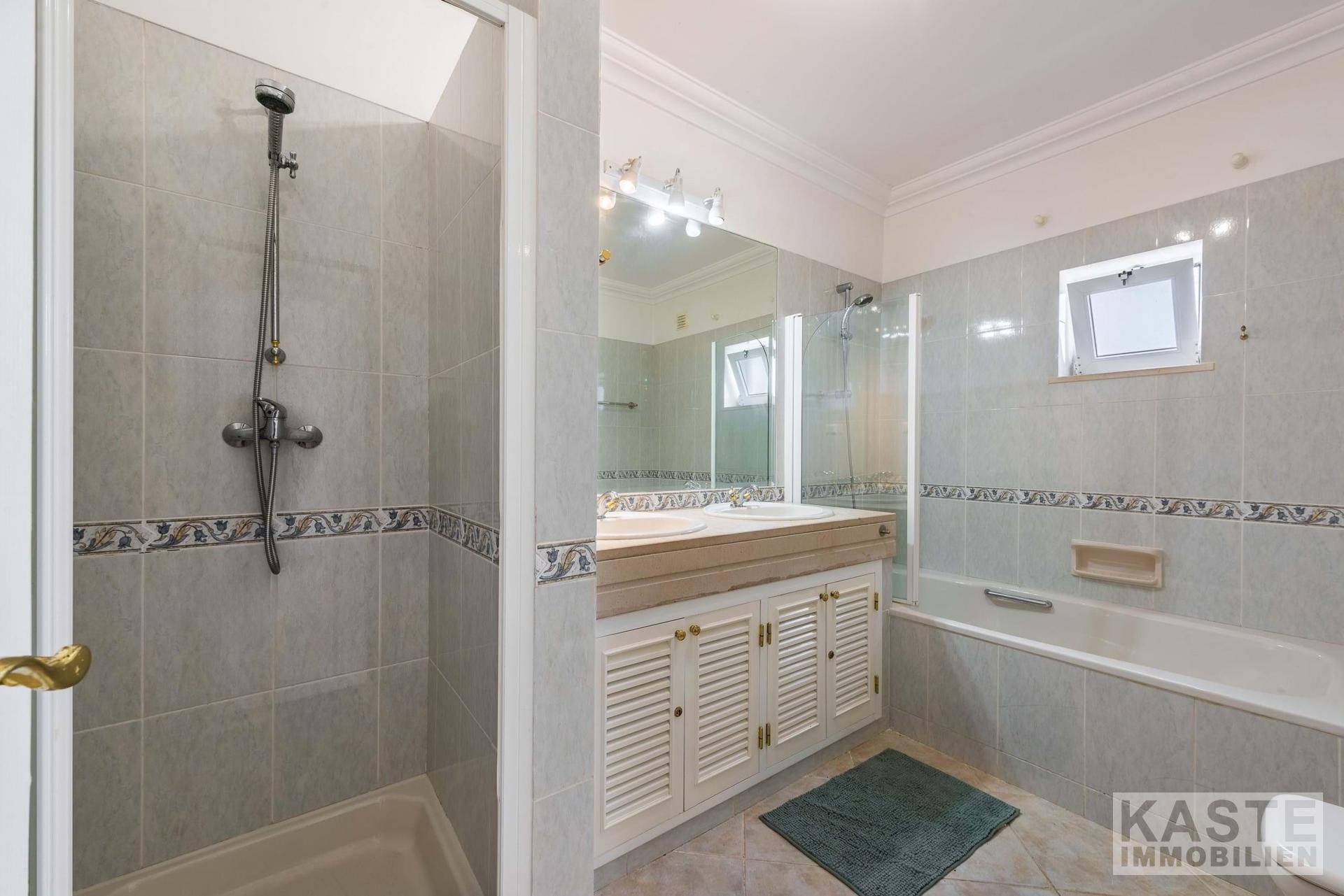 Das Hauptschlafzimmer en suite im Obergeschoss ist mit einem privaten Badezimmer und einem anliegenden Ankleidebereich ideal auf die Bedürfnisse moderner Bewohner abgestimmt. Ein weiteres Schlafzimmer im Obergeschoss bietet ebenfalls ein eigenes Duschbad und eine exklusive Terrasse mit faszinierendem Panoramablick auf das Monchique-Gebirge und die Küste. Im Erdgeschoss stehen zwei weitere Schlafzimmer sowie ein Familienbadezimmer zur Verfügung.