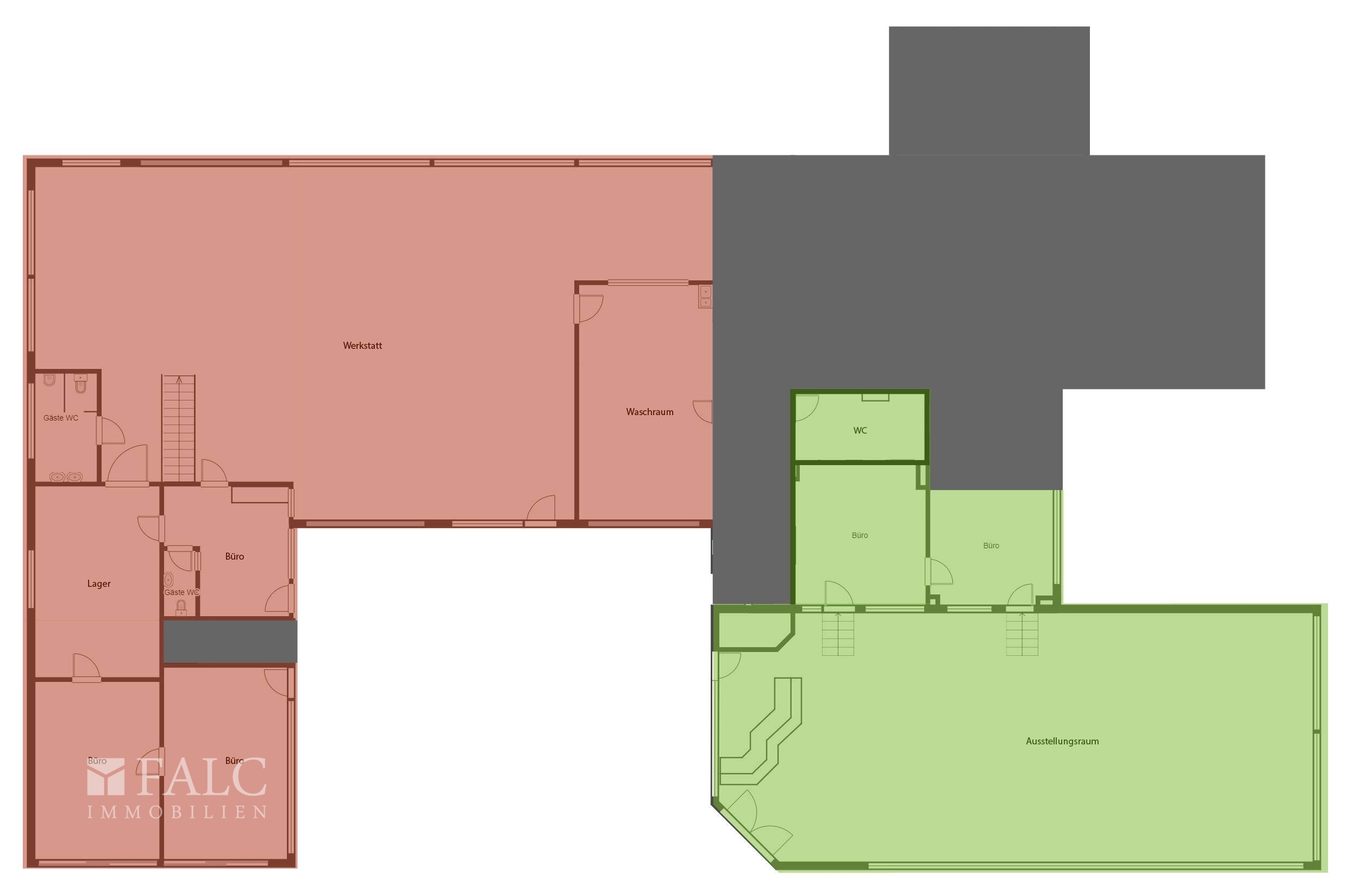 - Nutzung des ehemaligen Ausstellungsraums inkl. der angrenzenden Büro- und Sozialräume gemäß dieses Exposés mit der Objektnummer FALC-VS-76183. - zusätzliche Nutzung der ehemaligen Werkstatt inkl. der Ausstellungs-, Büro- und Kellerräume des linken Gebäudeteils gemäß des Exposés mit der Objektnummer FALC-VS-76178. - Auf Wunsch kann das gegenüberliegende Grundstück mit ca. 937m² als Abstell- und Lagerfläche zusätzlich angemietet werden.