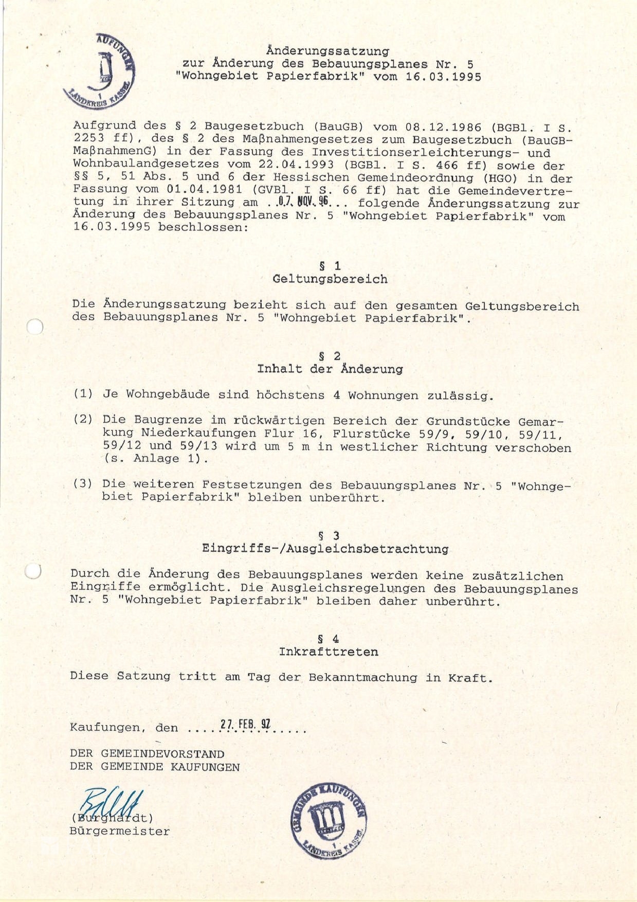 Für das Grundstück gibt es von der Gemeinde einen Bebauungsplan. In diesem steht unter anderem, dass auf dem Grundstück ein Wohngebäude mit 2 Vollgeschossen und bis zu 4 Wohnungen errichtet werden kann. Außerdem ist in diesem Geltungsbereich des Bebauungsplanes gemäß § 13 BauNVO Räume für freie Berufe zulässig. Das gilt auch für Gebäude, die in ihrer Gesamtheit der Berufsausübung freiberuflich Tätiger dienen, sofern die Zulässigkeitsbeschränkungen nach § 15 BauNVO eingehalten werden.