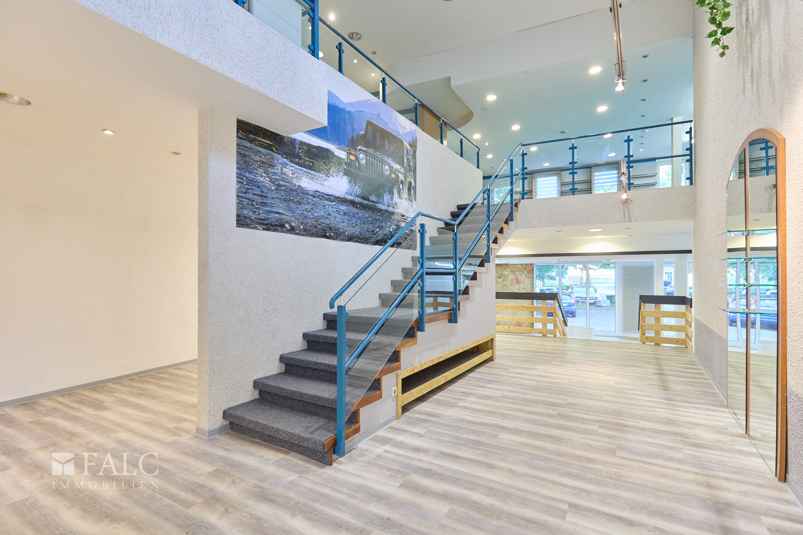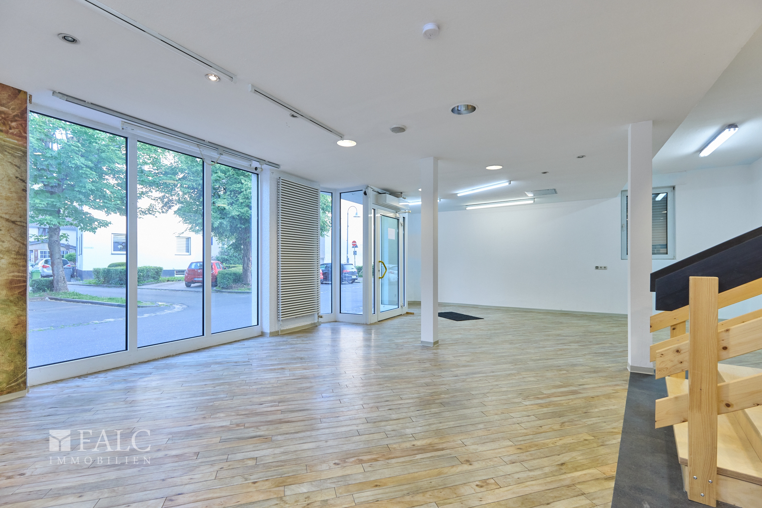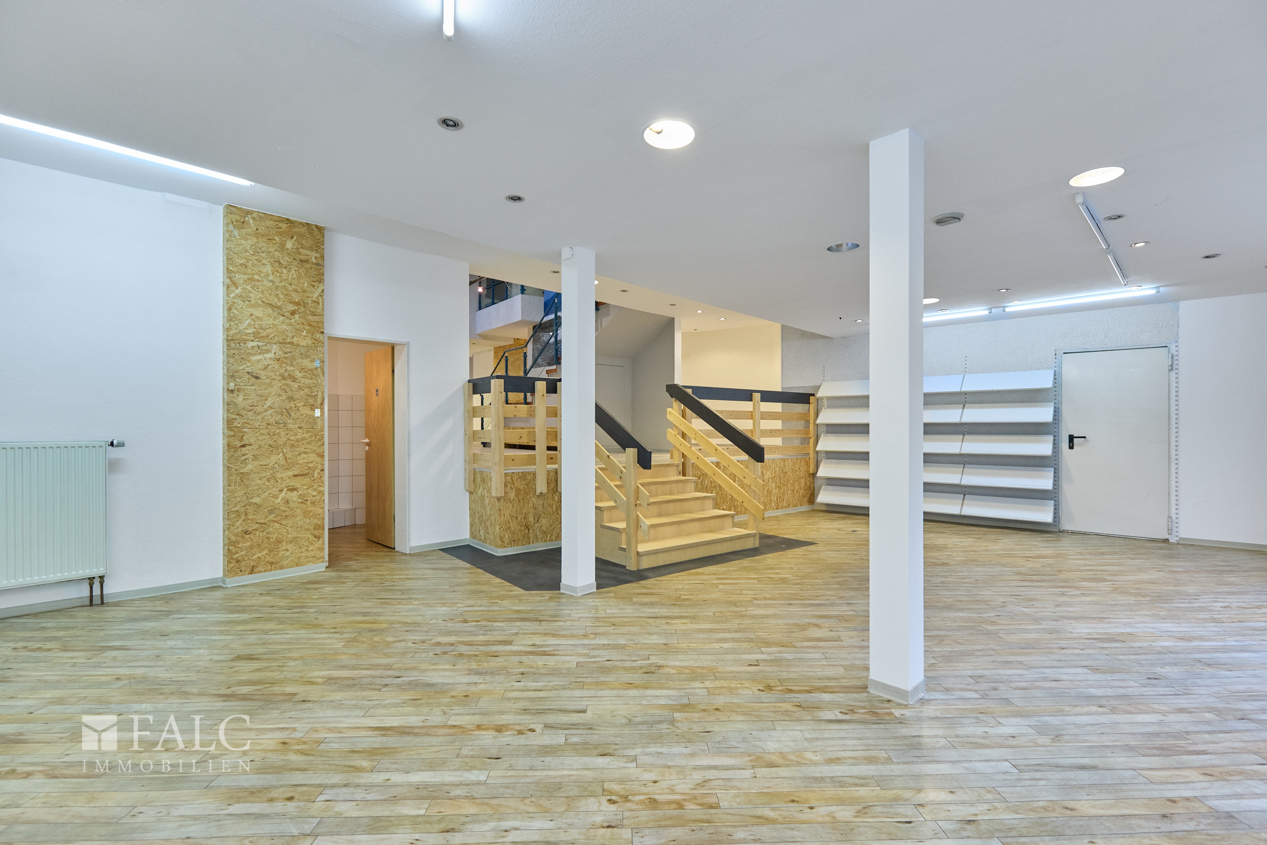 Die rund 270 m² große Gewerbefläche verteilt sich auf zwei Etagen und ist über zwei separate Eingänge zugänglich – einer davon direkt vom Marktplatz, der andere von der Schleidanusstraße mit direkter Anbindung an den öffentlichen Parkplatz.