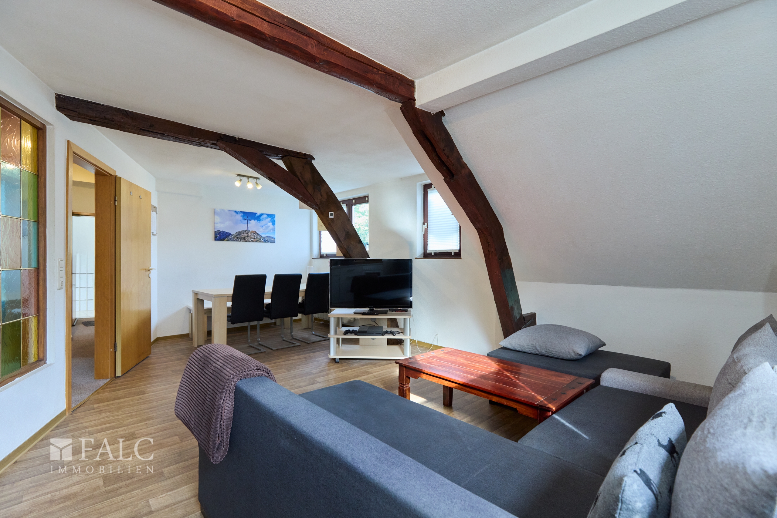 Ob Einzelhandel, Büro, Praxis, Gastronomie oder Atelier: Die Fläche lässt sich flexibel gestalten und eröffnet zahlreiche Nutzungsmöglichkeiten. Die beiden Wohneinheiten mit ca. 78 m² im Obergeschoss und ca. 61 m² im Dachgeschoss sind langfristig vermietet und tragen zu einer soliden Einnahmebasis bei.