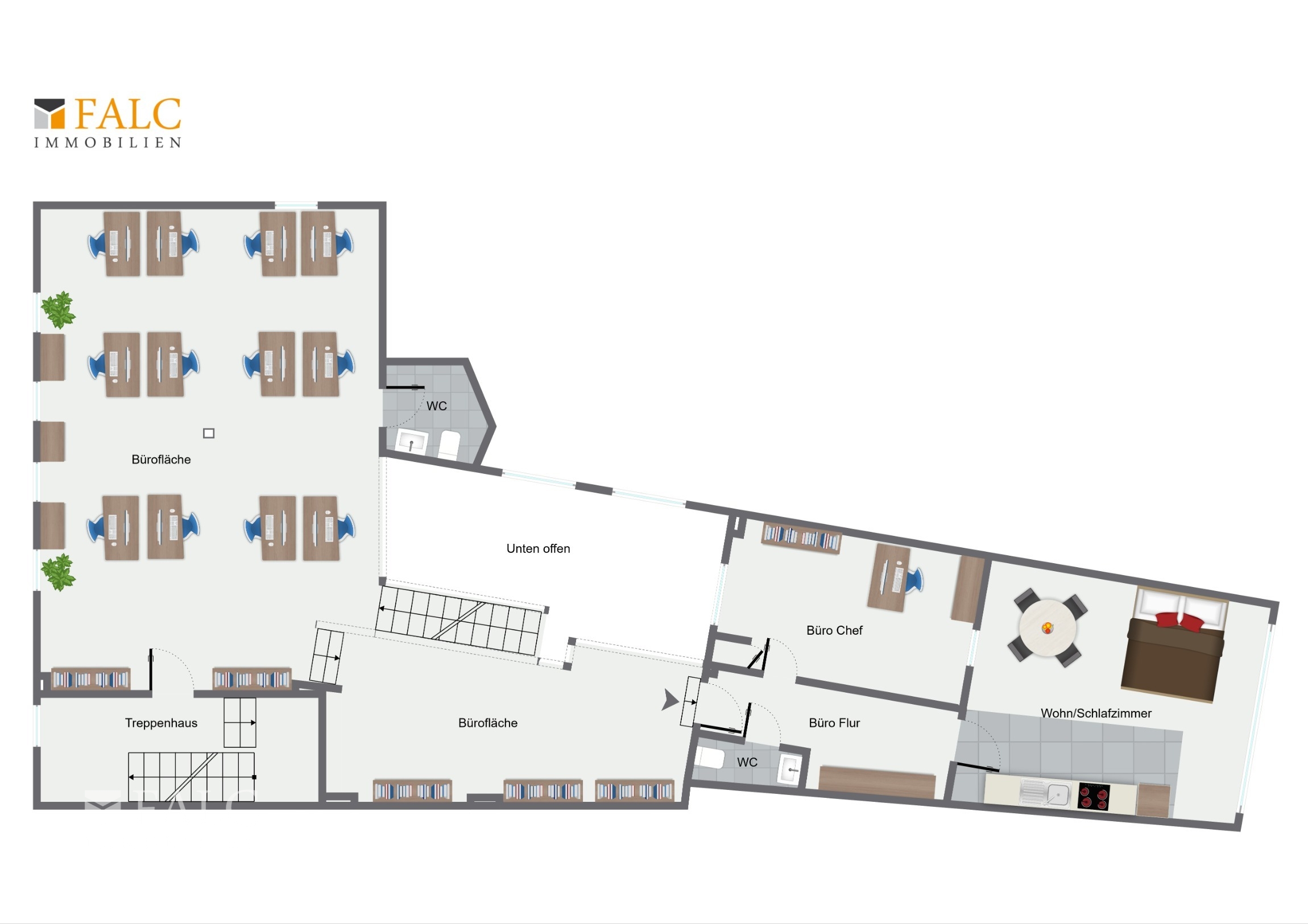 Das voll unterkellerte Gebäude bietet zusätzlich großzügige Lagerflächen und ist somit auch für Konzepte mit erhöhtem Stauraumbedarf bestens geeignet.