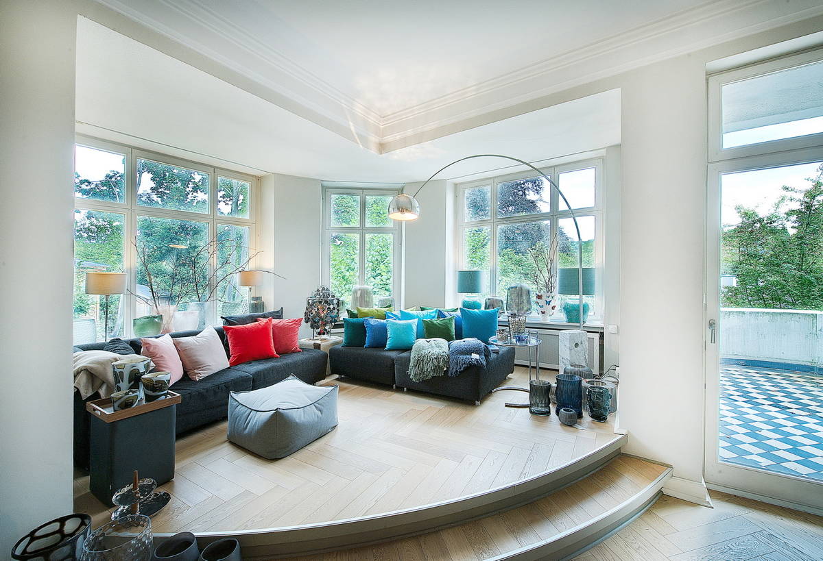 Im Erdgeschoss erwartet Sie ein großzügiger Empfangsbereich, ein weitläufiges Wohnzimmer mit Kamin und Zugang zur Terrasse, ein stilvolles Esszimmer sowie eine geräumige Küche mit direktem Gartenzugang. Große Fensterfronten sorgen für lichtdurchflutete Räume und einen harmonischen Übergang zwischen Innen- und Außenbereich.