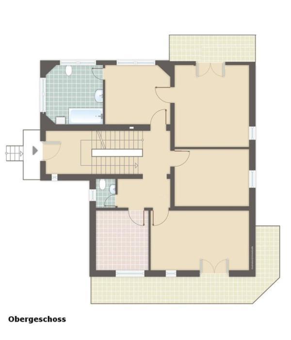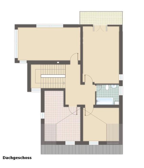 Dachgeschoss: wird zur Zeit als Büro genutzt, 4 große Räume: mit Kamin und Balkon, Küchenbereich, Bad mit Wanne und Dusche