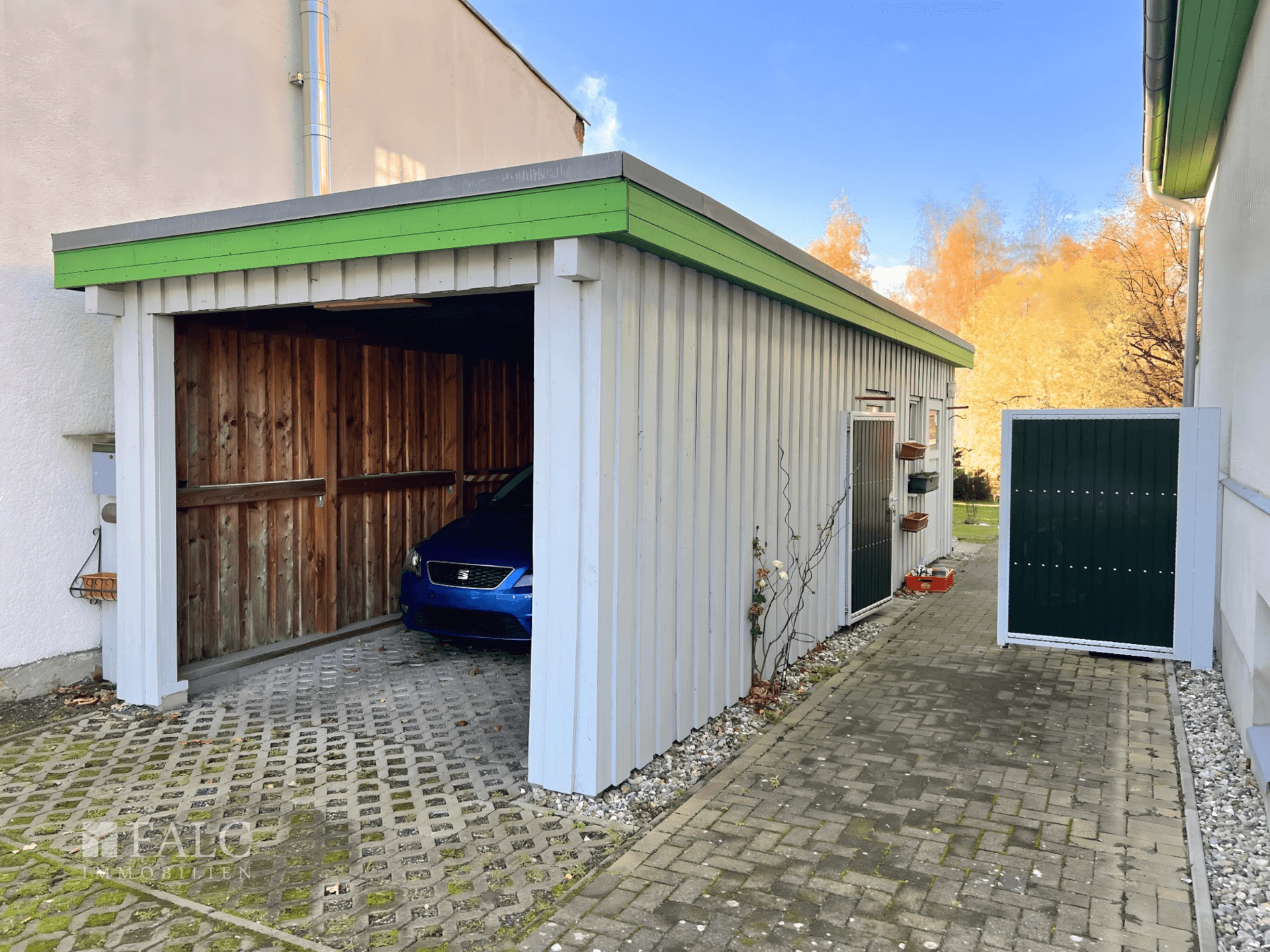 Außenbereich: - Terrasse ideal für Abendstunden - Carpot mit Geräteschuppen für ein Fahrzeug sowie Fahrräder - Separater Schuppen für Gartengeräte oder zusätzliche Lagerfläche