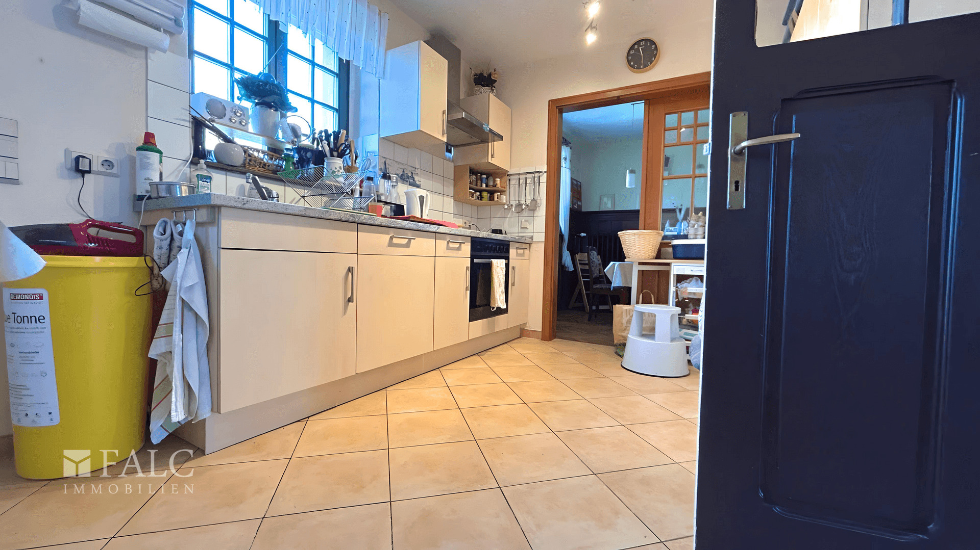 Offener Wohn-und Essbereich mit angrenzender Küche: - Einbauküche mit Elektrogeräten - Direkter Zugang zur Terrasse für ein harmonisches Innen- und Außenleben
