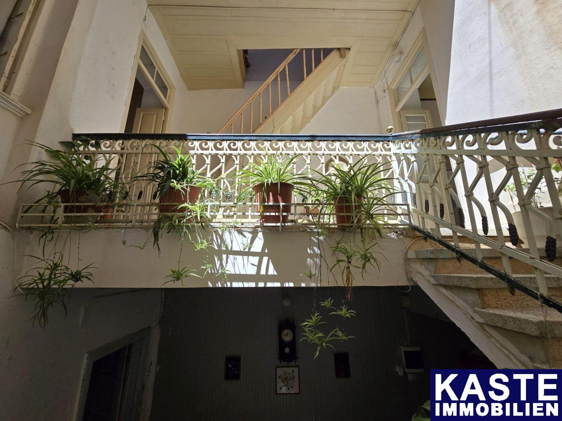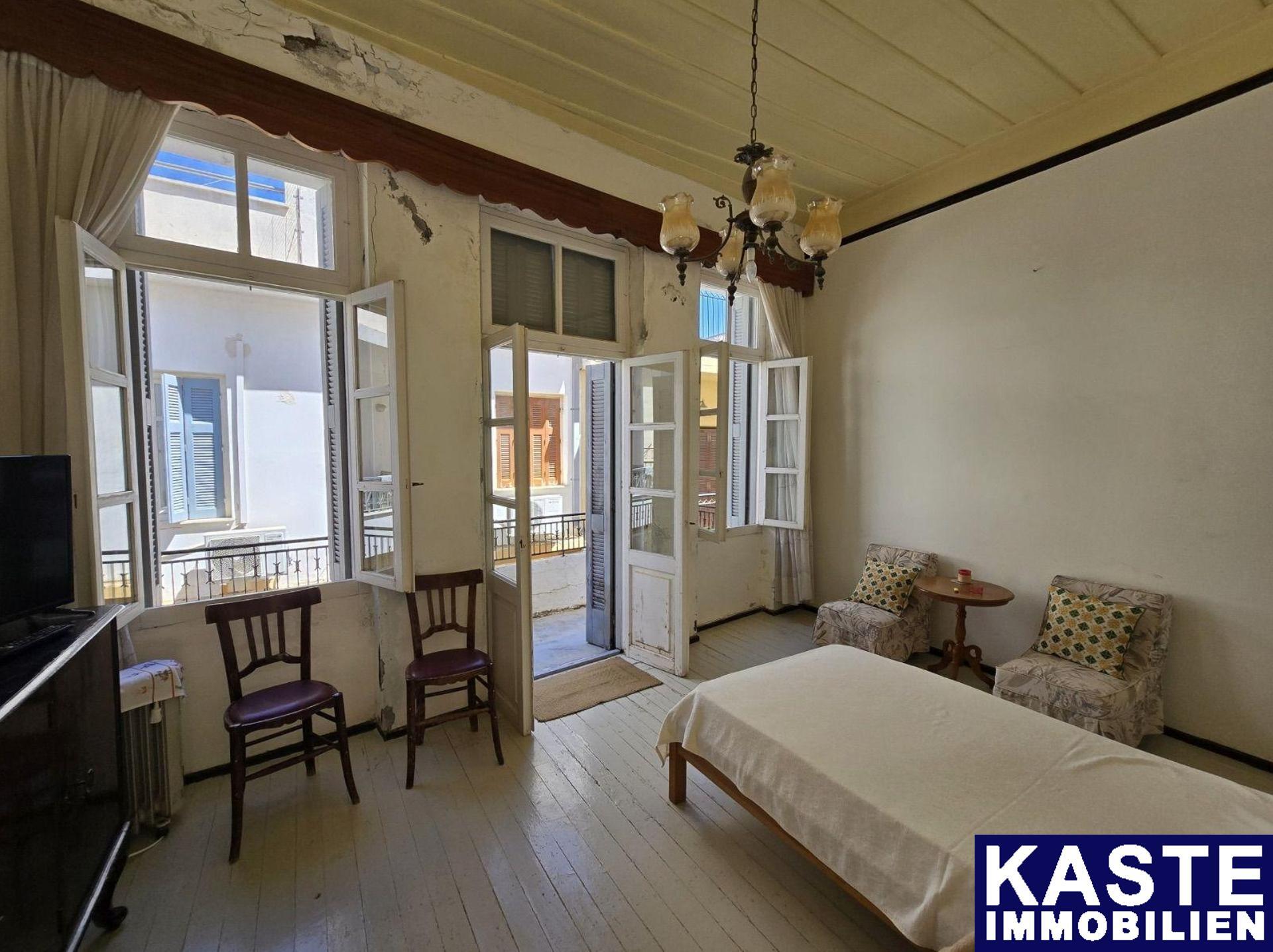 Im oberen Stockwerk befinden sich zwei weitere Schlafzimmer und ein Badezimmer auf 62 m². Die dortige Terrasse bietet nicht nur Panoramablicke über die historische Altstadt von Rethymno, sondern sorgt auch für entspannte Momente an der frischen Luft. Das gesamte Gebäude befindet sich in renovierungsbedürftigem Zustand und bietet damit die Möglichkeit, moderne Standards mit traditionellem Charme zu verbinden.