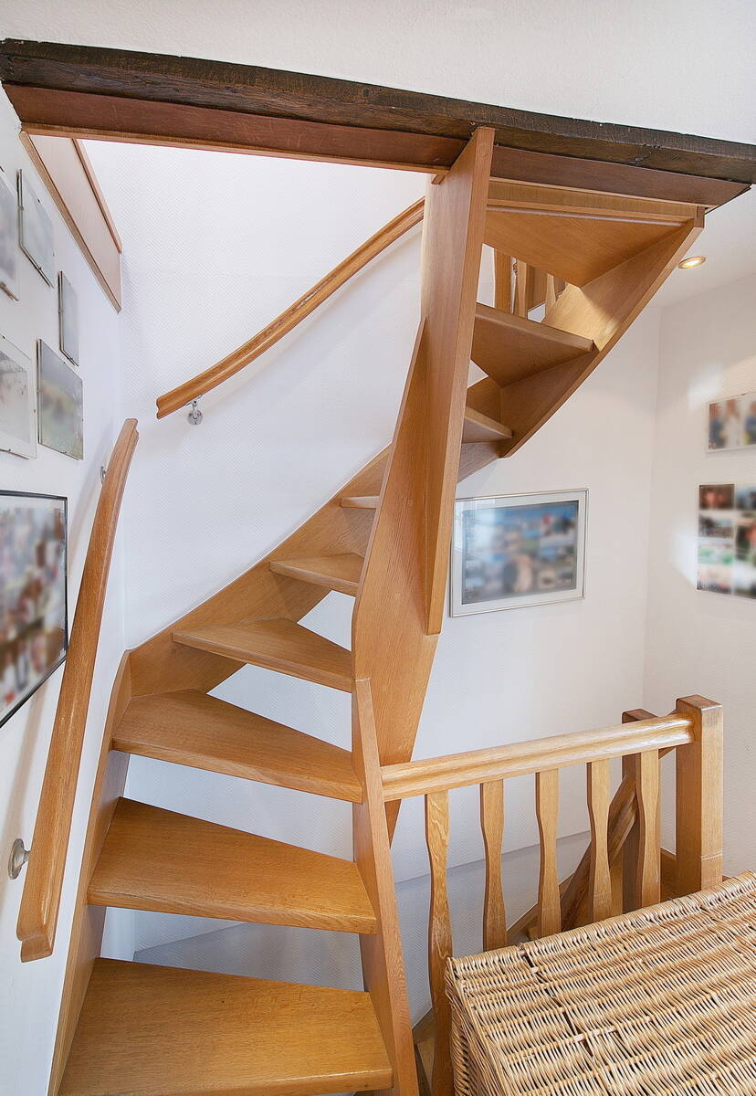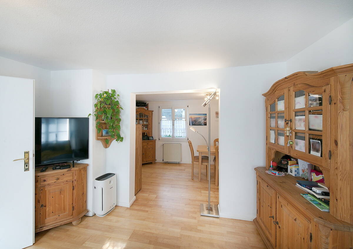 Über die Treppe erreichen Sie das Obergeschoss. Hier befinden sich ein Schlafzimmer, ein großzügiges Badezimmer mit Badewanne sowie ein davorliegendes Durchgangszimmer, das sich ideal als Arbeits- oder Ankleidezimmer eignet.