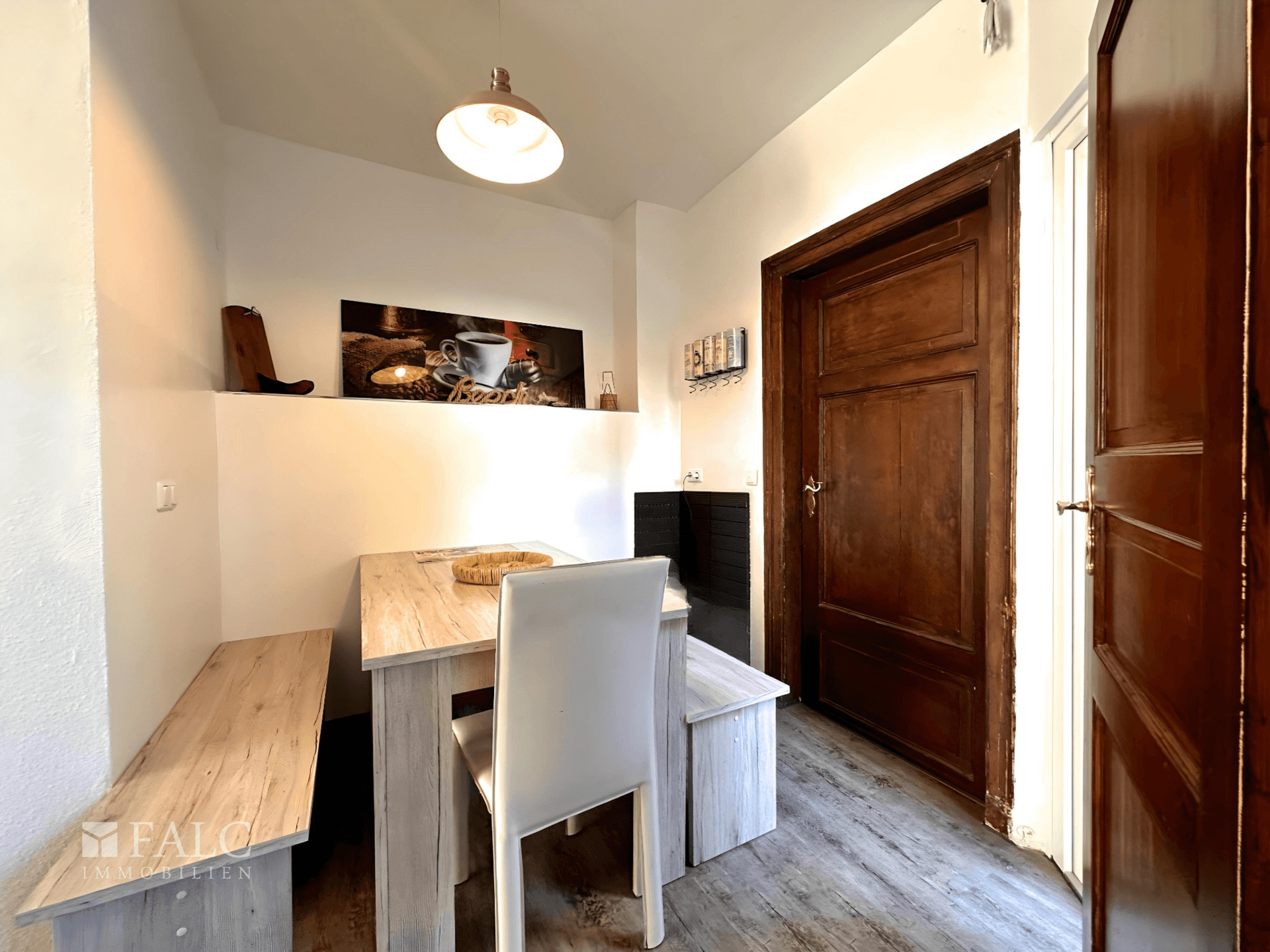Schon beim Betreten des Hauses spürt man den besonderen Charme der traditionellen Bauweise, verbunden mit den modernen Vorzügen einer umfassenden Sanierung aus dem Jahr 2015. Der Eingangsbereich führt zunächst in einen kleinen Flur, von dem aus sich geradewegs der Zugang zum Innenhof mit Terrasse und praktischem Abstellraum eröffnet – ein geschützter, idyllischer Ort für erholsame Stunden im Freien.
