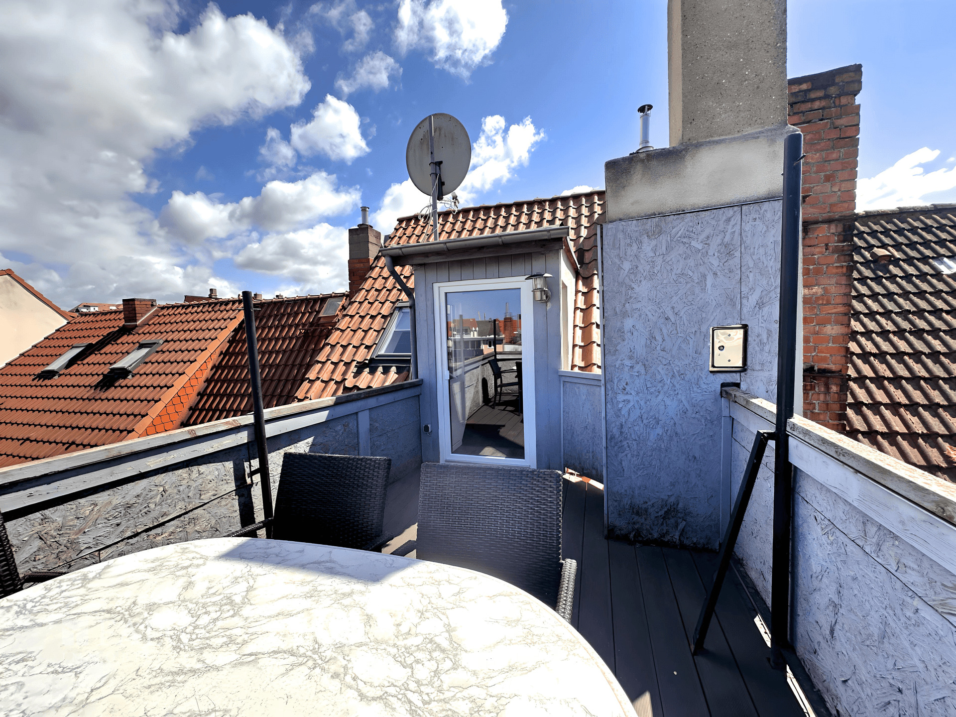 Das zweite Obergeschoss bietet einen lichtdurchfluteten Wohnraum mit Zugang zur Dachterrasse, die einen wunderschönen Blick über die Dächer der Altstadt eröffnet und an klaren Tagen sogar maritime Impressionen einfängt.