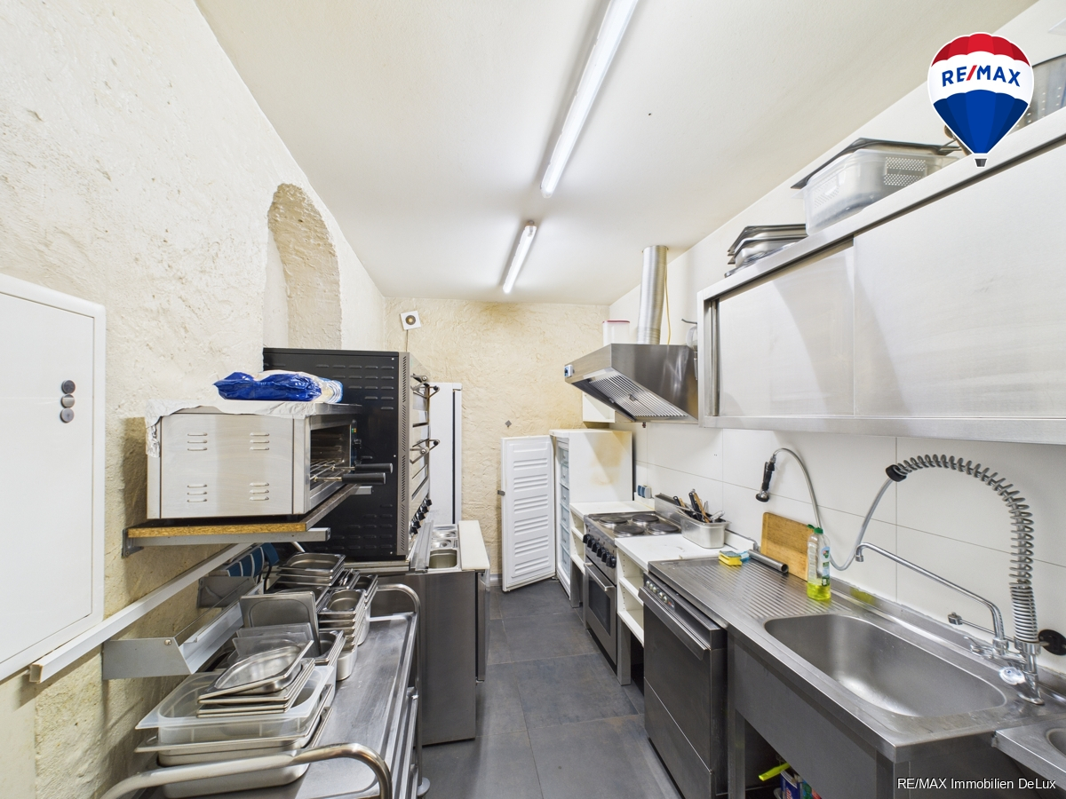 Die gut durchdachte Raumaufteilung lässt keine Wünsche offen: Direkt beim Betreten der Gaststätte führt eine Treppe nach unten in den großzügigen Keller mit mehr als 100 m², perfekt für Lagerung. Im Erdgeschoss finden Sie den einladenden Essbereich mit Tischen, gefolgt von der gut ausgestatteten Theke und der modernen Küche auf der rechten Seite. Hier werden kulinarische Köstlichkeiten zubereitet, die Ihre Gäste begeistern werden.