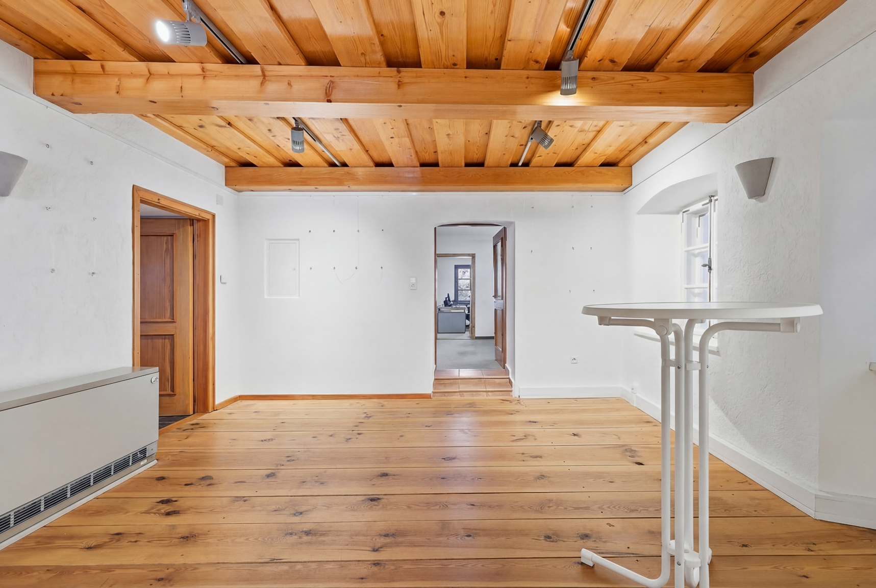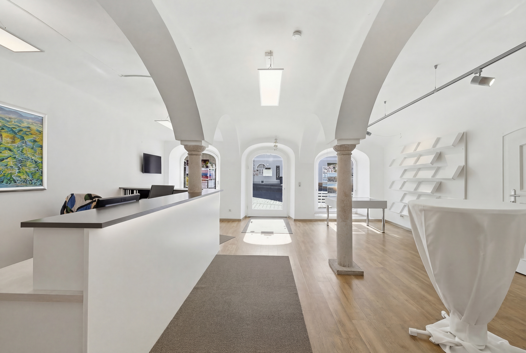 Bereits das Erdgeschoss beeindruckt mit architektonischen Details von außergewöhnlichem Reiz: Massive Säulen tragen ein charakteristisches Kreuztonnengewölbe und verleihen den Räumlichkeiten eine historische Tiefe, die heute nur noch selten zu finden ist. Aktuell befindet sich hier ein etabliertes Tourismusbüro, das durch seine zentrale Lage von einer konstanten Besucherfrequenz profitiert und dem Haus eine solide gewerbliche Basis bietet. Die repräsentative Gestaltung eignet sich ebenso hervorragend für Einzelhandel, Dienstleistung oder eine stilvolle Praxis- bzw. Büroeinheit.