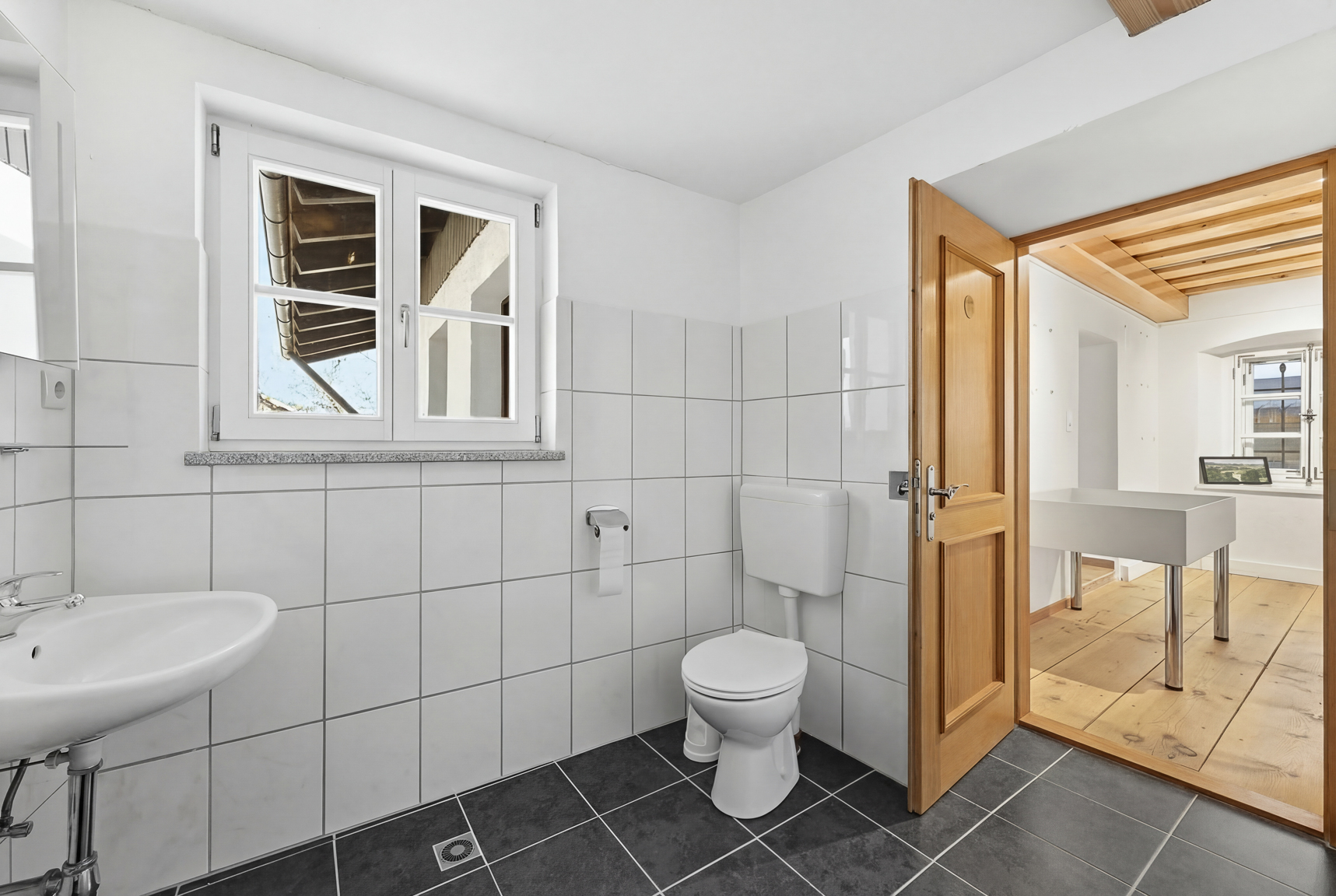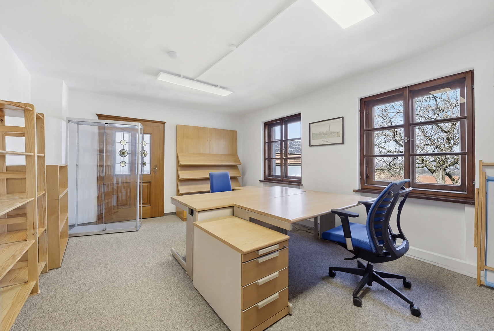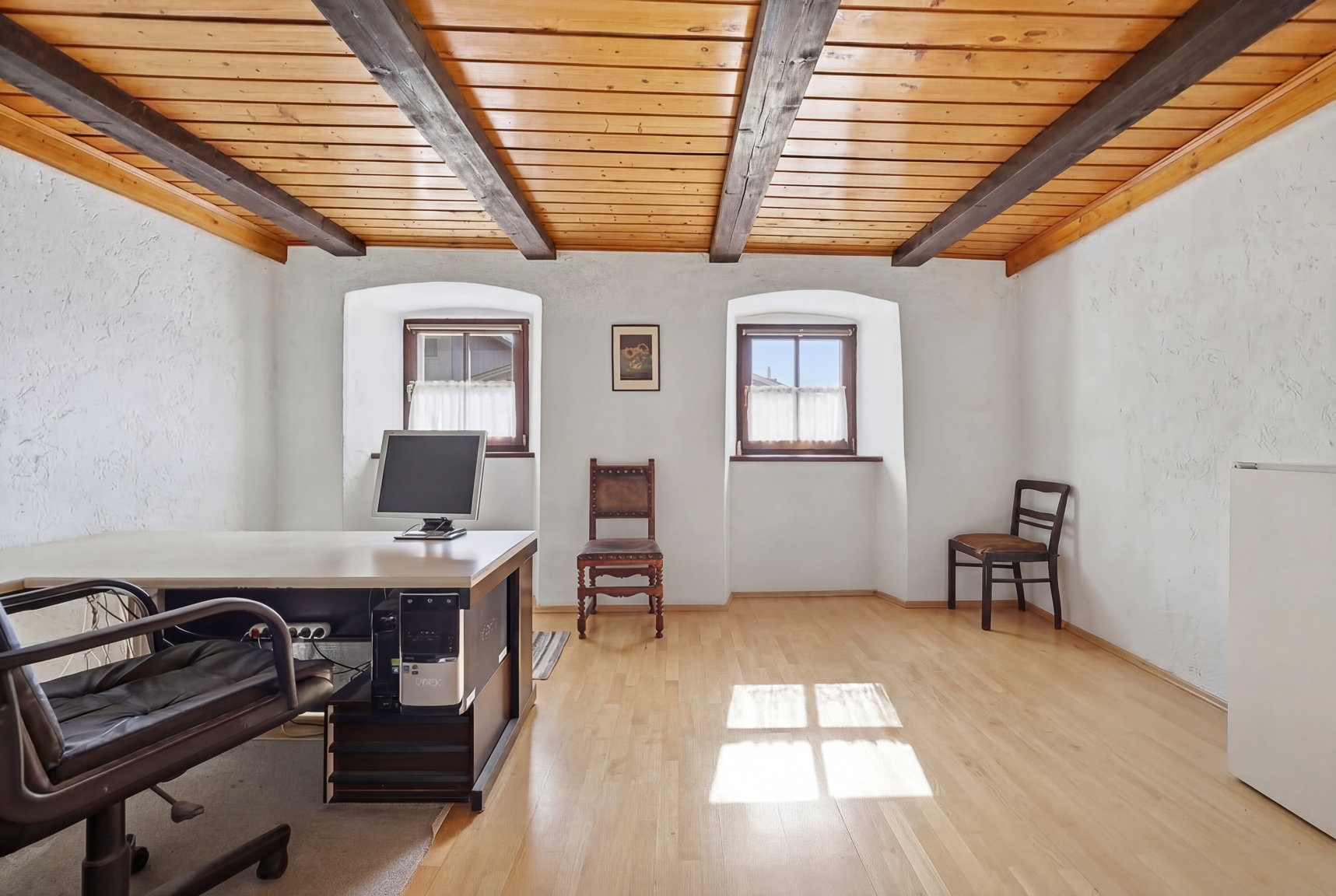 Das Obergeschoss überzeugt mit einer großzügigen Wohnfläche und flexibler Raumaufteilung. Zwei Bäder sowie weitläufige Zimmer eröffnen zahlreiche Gestaltungsoptionen: von einer modernen, großzügigen Wohneinheit über eine repräsentative Bürofläche bis hin zu einer Kombination aus Wohnen und Arbeiten unter einem Dach. Die Verbindung aus historischen Elementen und individuellem Ausbaupotenzial schafft ein einzigartiges Wohn- und Arbeitsumfeld.