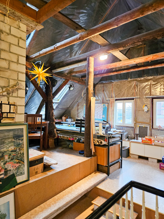 Der überaus geräumige Dachboden mit imposanter Höhe bis in den Giebel, könnte - vorbehaltlich der Zustimmung von Bau- und Denkmalschutzamt - eventuell für zusätzliche Wohn- oder Nutzfläche ausgebaut werden.
