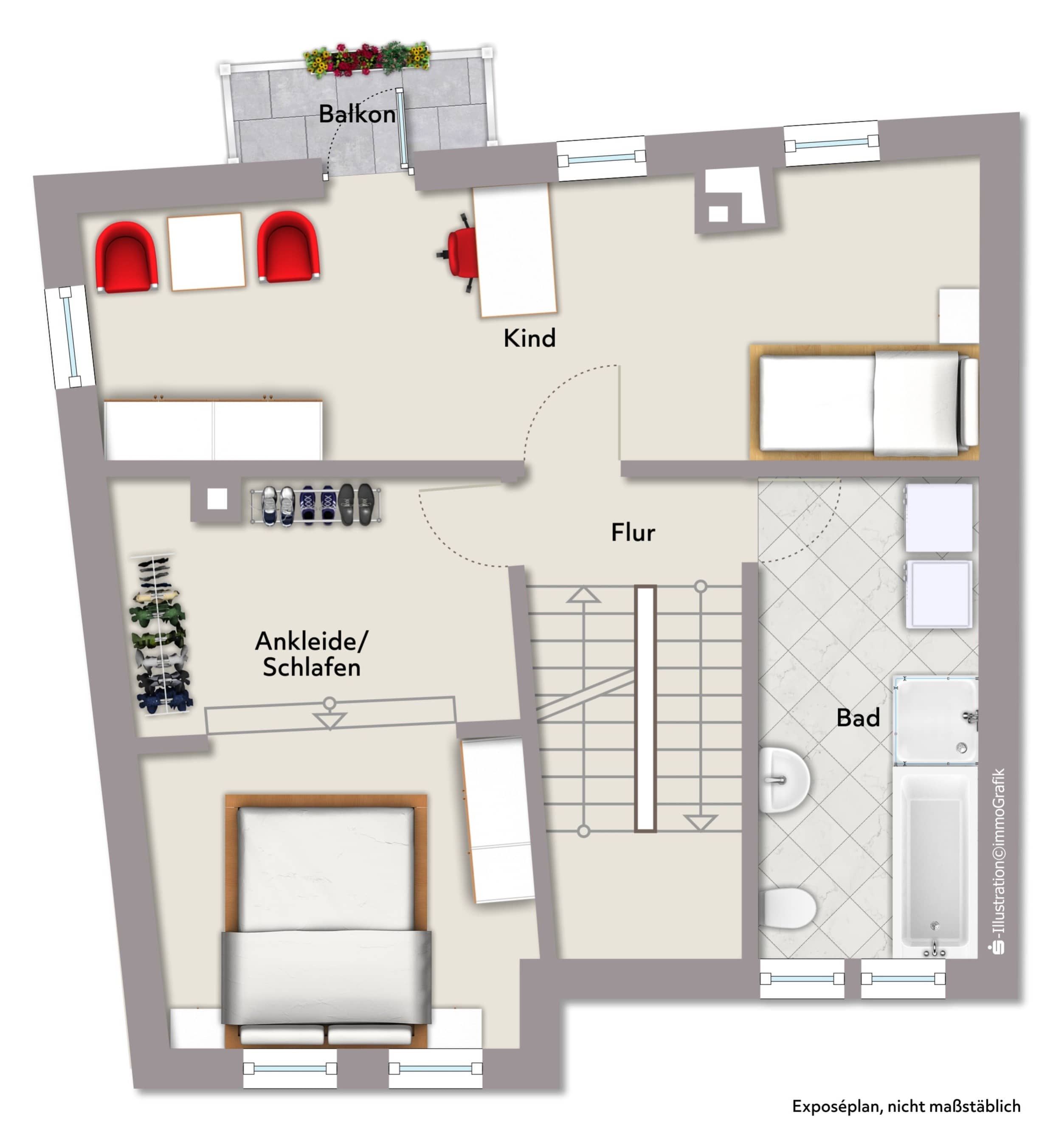 Das Obergeschoss beherbergt zwei gut geschnittene Zimmer, die vielseitig nutzbar sind – ob als Rückzugsort, Arbeitszimmer oder Kinderzimmer. Das Badezimmer ist funktional ausgestattet und verfügt über eine Badewanne und Dusche.