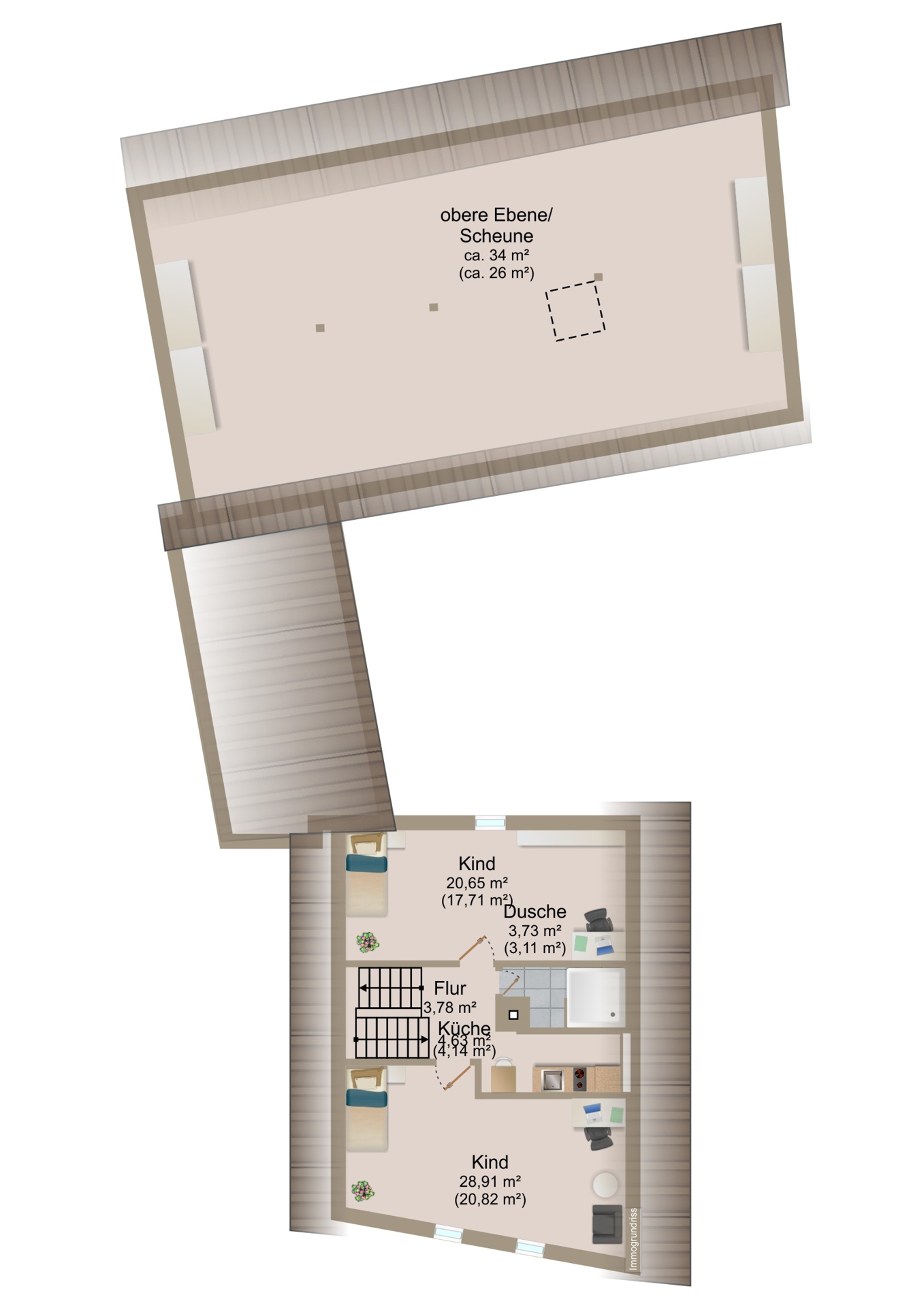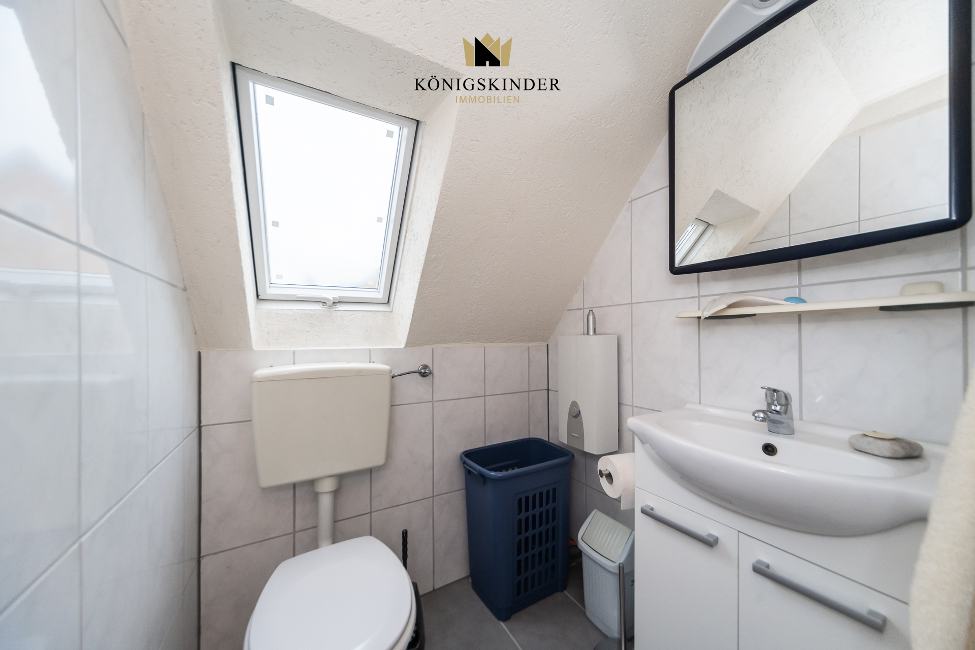 Ein weiterer ausgebauter Bereich im Dachgeschoss erweitert das Platzangebot um zwei zusätzliche Zimmer, ein weiteres Bad sowie eine zweite Küche. Diese Ebene eignet sich hervorragend als separate Wohneinheit für erwachsene Kinder oder Gäste.