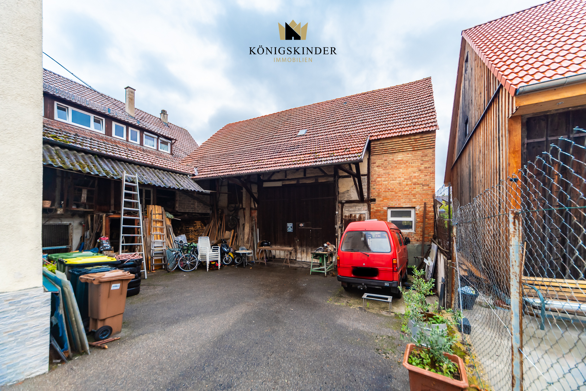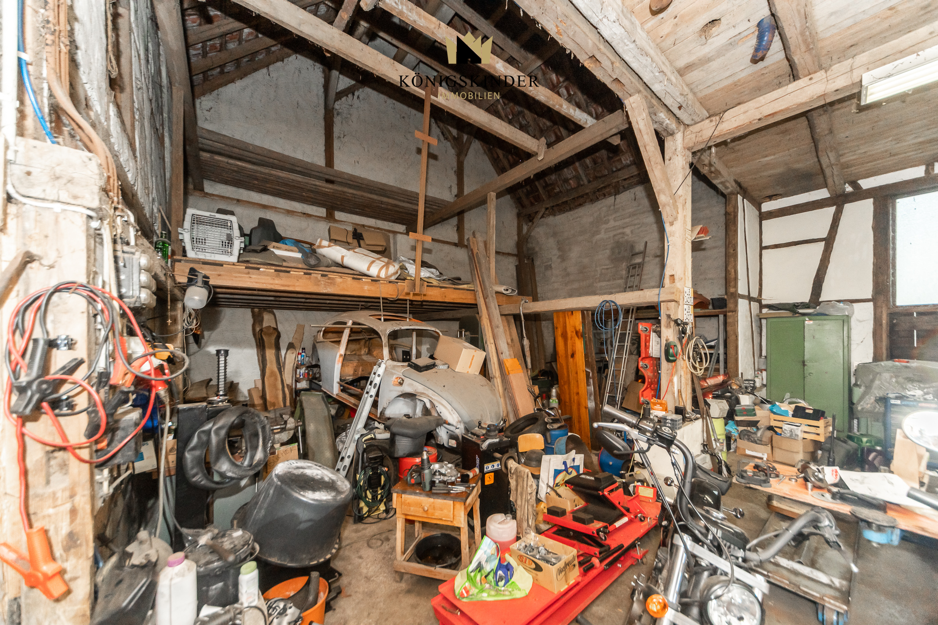 Außerhalb des Wohnhauses steht eine sehr große Scheune zur Verfügung, die vielseitig genutzt werden kann – etwa als Hobbyraum, Werkstatt, Lagerfläche oder für handwerkliche und kreative Projekte. Eine Garage sowie mehrere Stellplätze im geschützten Innenhof runden das Angebot ab und bieten komfortable Parkmöglichkeiten direkt am Haus.