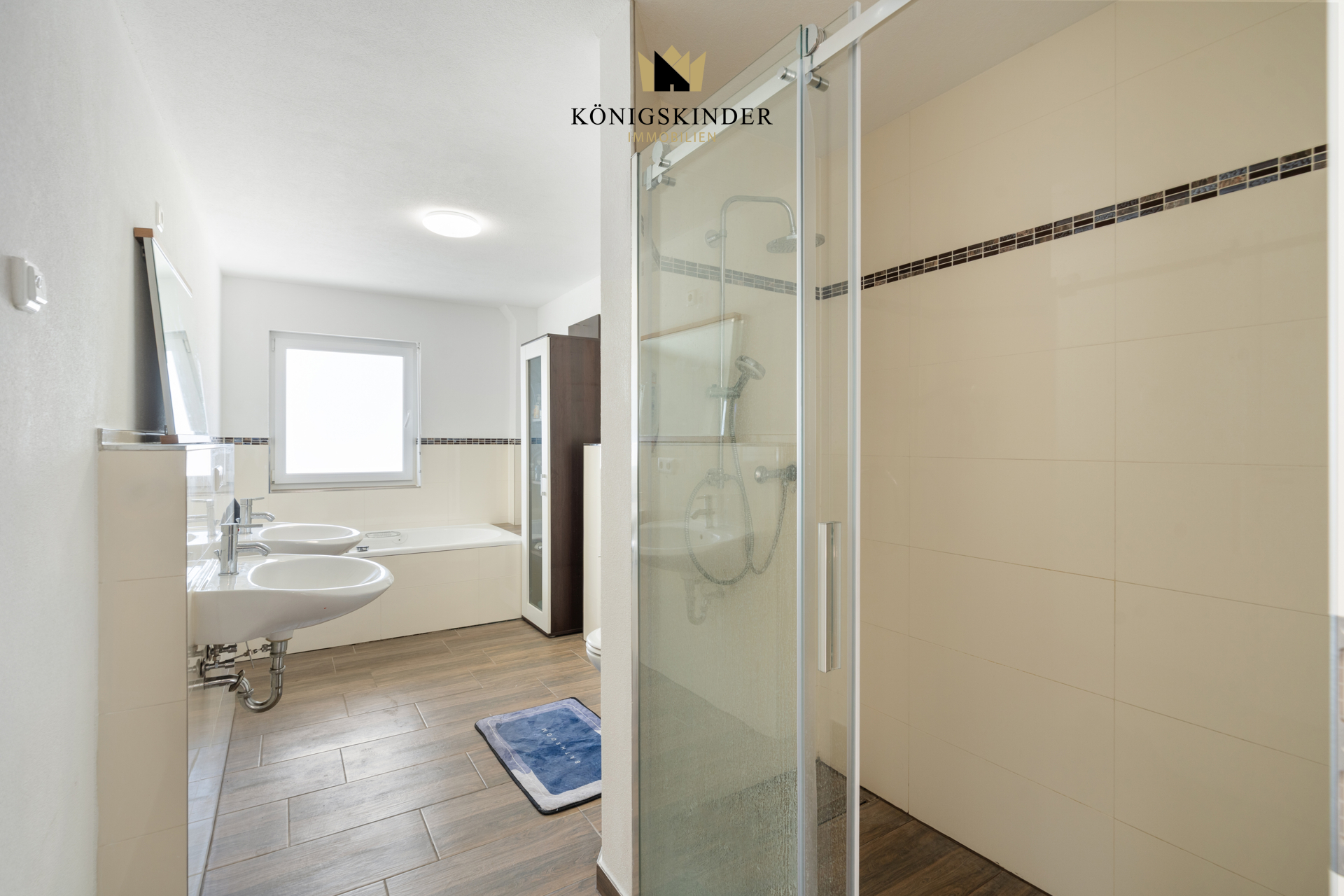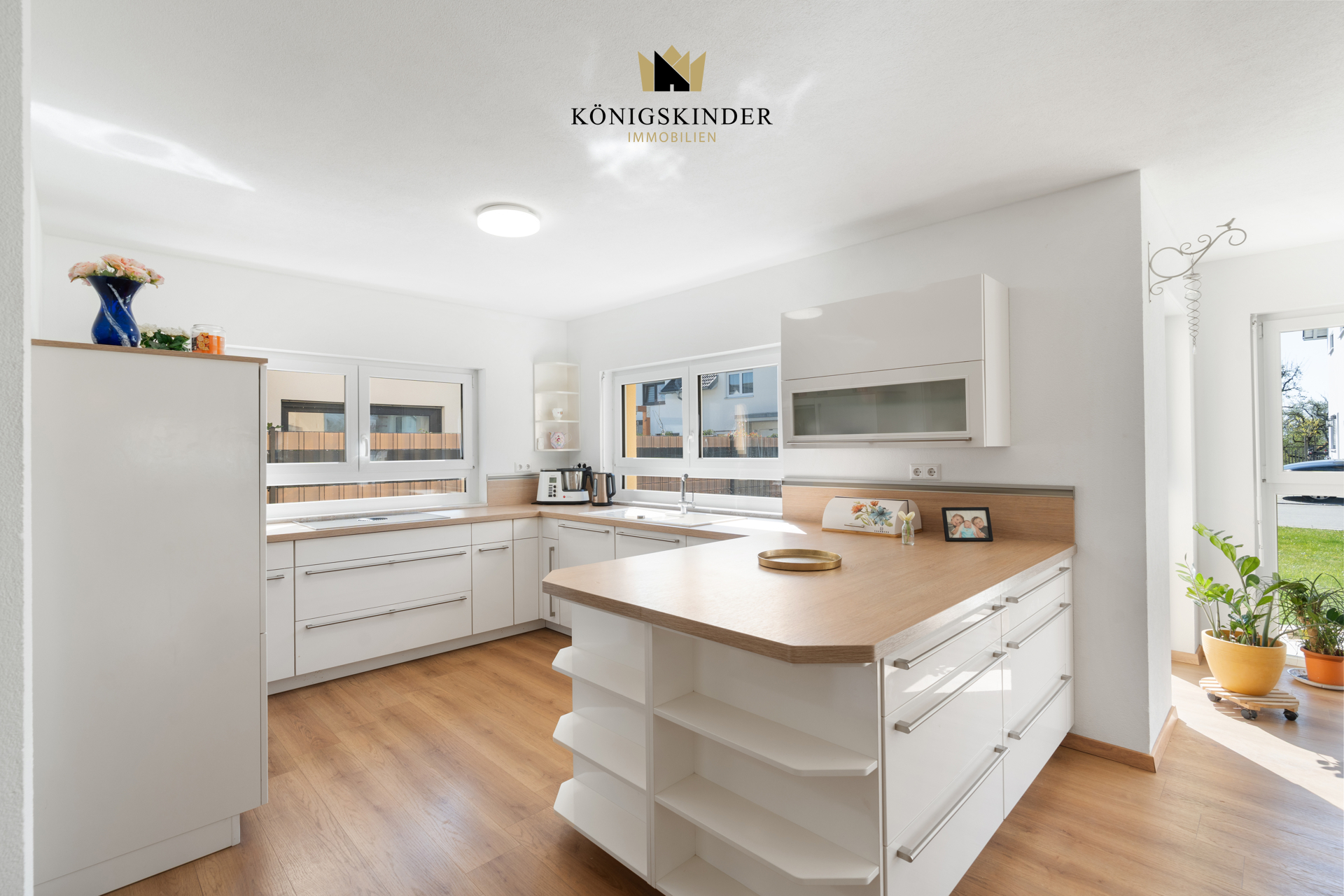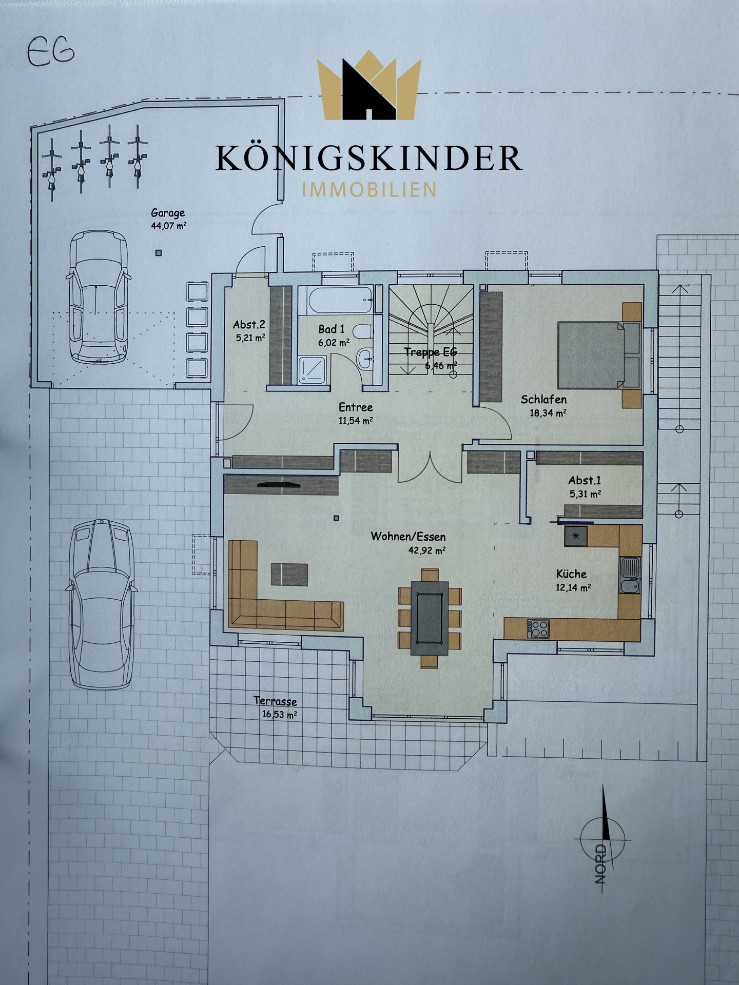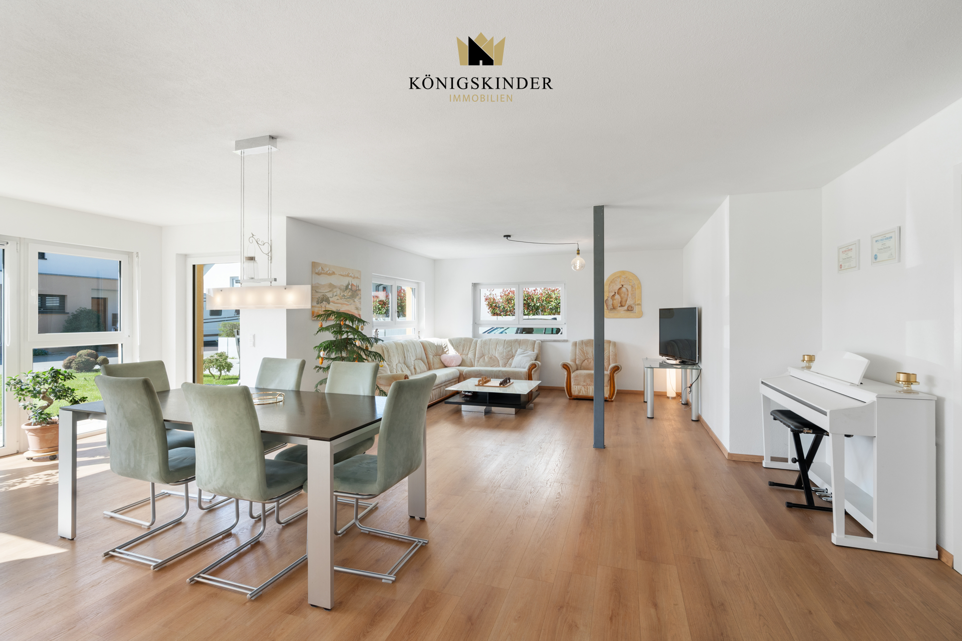 Im Erdgeschoss befindet sich der große Wohn/Essbereich mit Küche und Zugang zum Garten, Büro/Gast, Bad sowie die Garderobe mit Zugang zur Garage.
