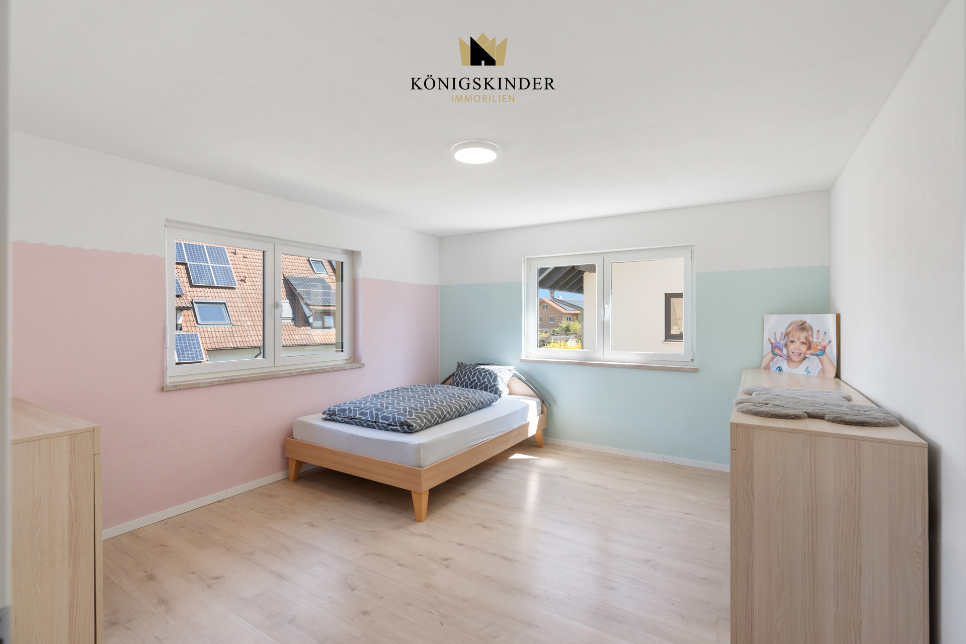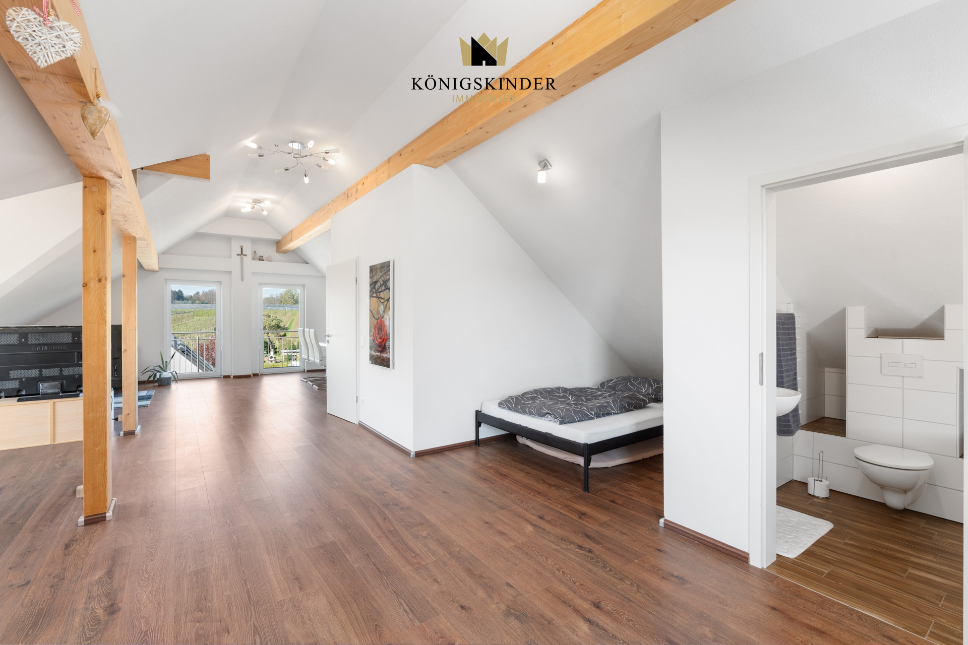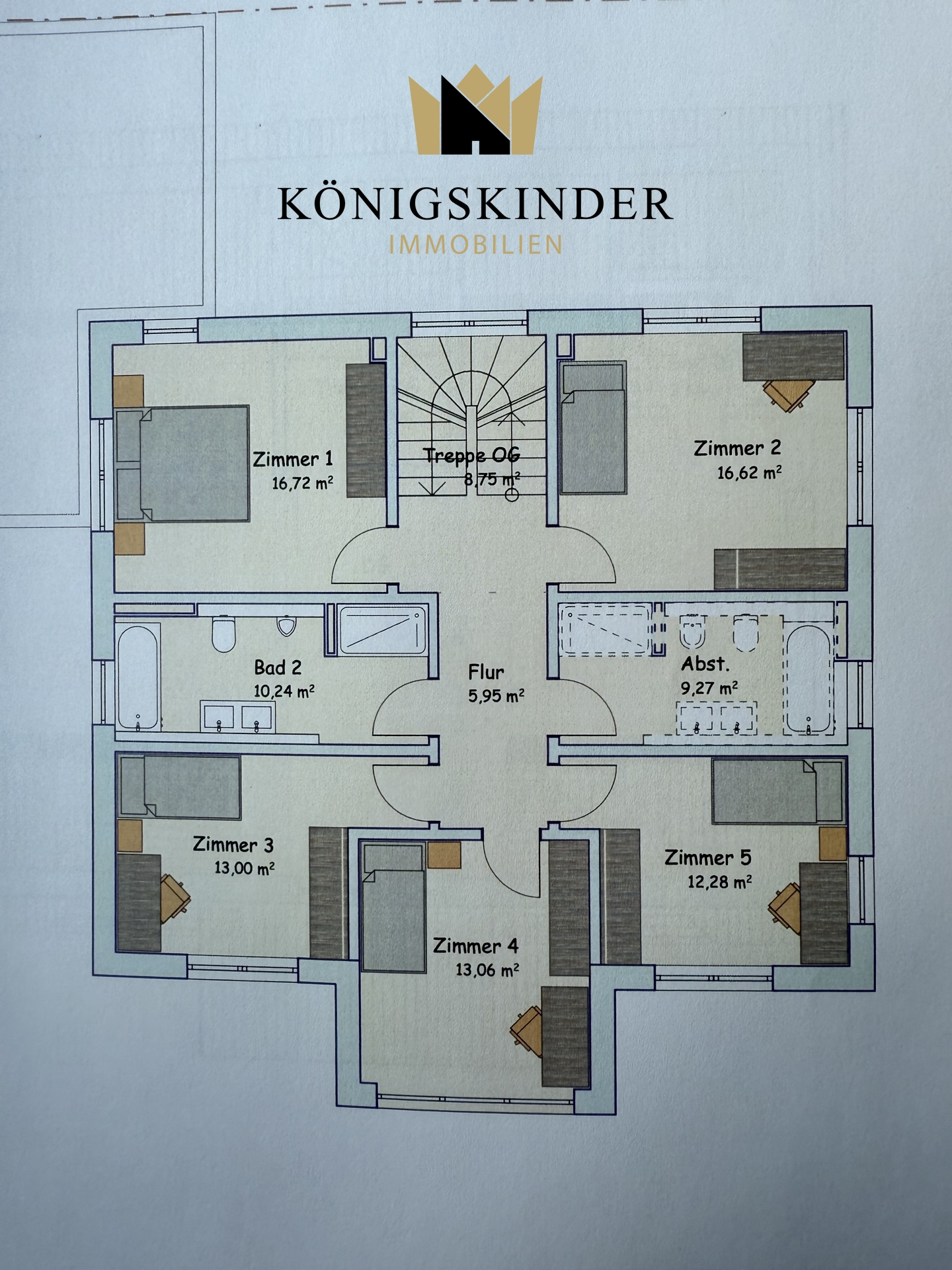 Im Obergeschoss sind 5 Schlafzimmer untergebracht sowie 2 Bäder, im Dachgeschoss das große Studio mit eigenem Badezimmer.