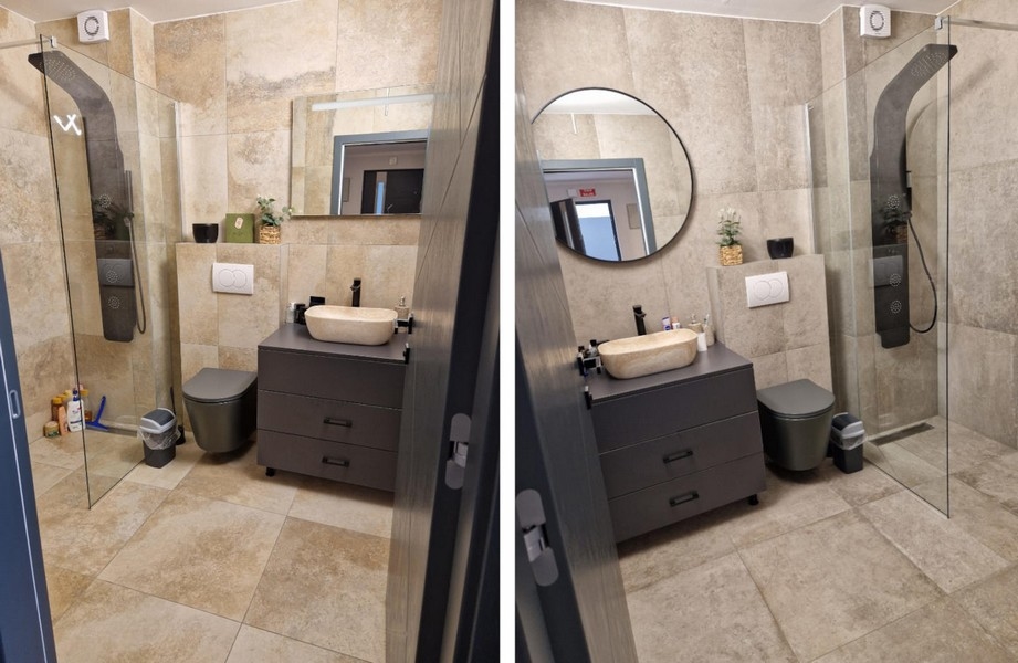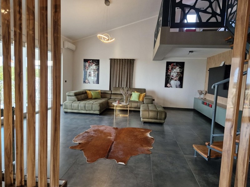 Im ersten Obergeschoss ist ein Appartement mit einer Wohnfläche von ca. 86 m² zur Verfügung. Die Wohnung teilt sich auf in eine Küche, einen Wohnbereich mit Esszimmer, 2 Schlafzimmer und 1 Badezimmer. Auch hier gelang man vom Wohnbereich aus auf eine großzügige Terrasse mit einer Fläche von ca. 24 m², welche einen traumhaften Blick auf das Meer und die Umgebung bietet. Kaufpreis: 326.116 EUR