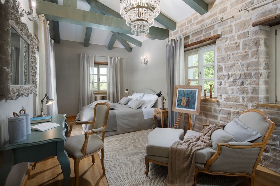 Im Obergeschoss befinden sich drei weitere Schlafzimmer, jedes mit eigenem Badezimmer. Zwei dieser Zimmer bieten Zugang zu Terrassen, die mit einem malerischen Blick ins Grüne und auf das Meer in der Ferne beeindrucken.