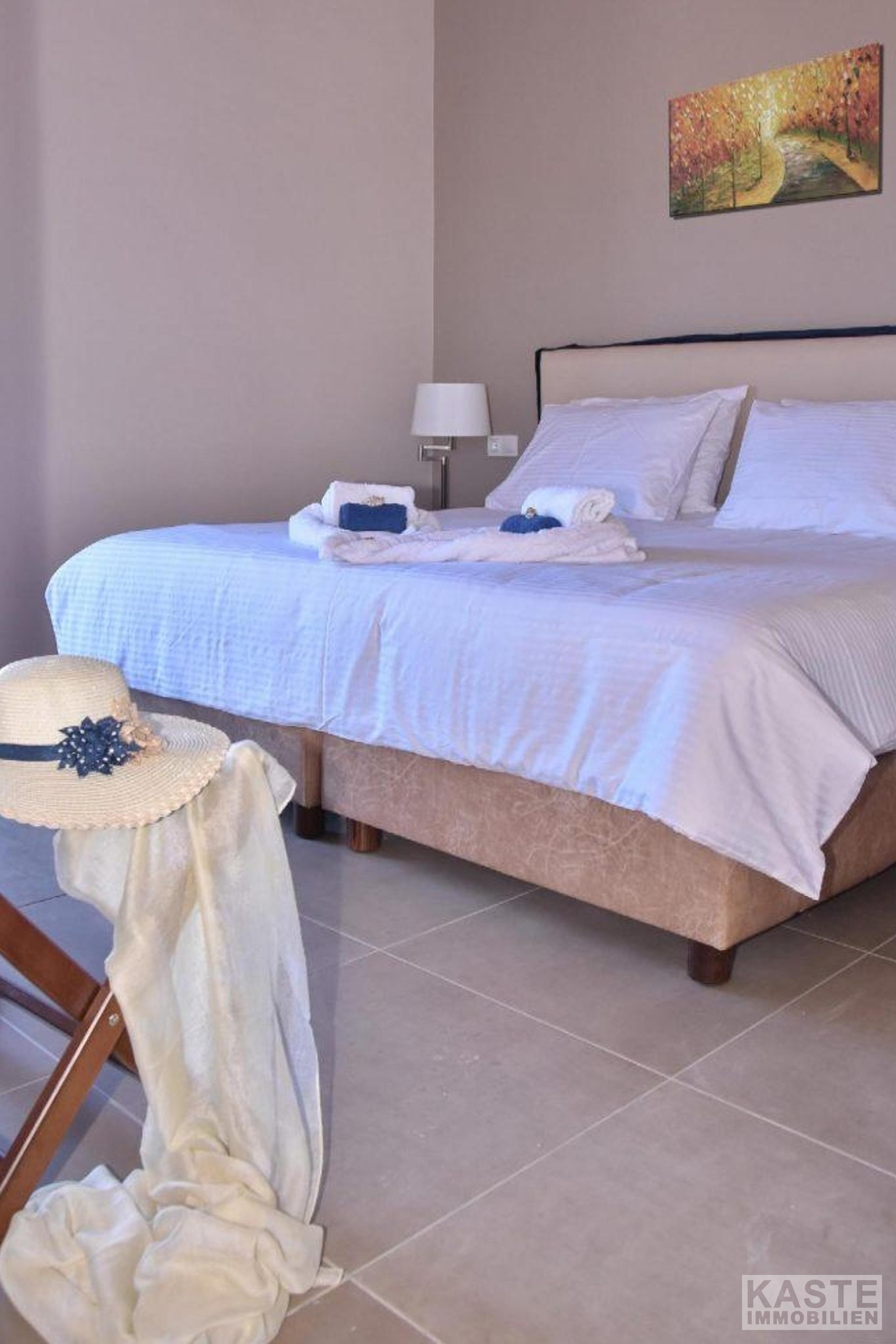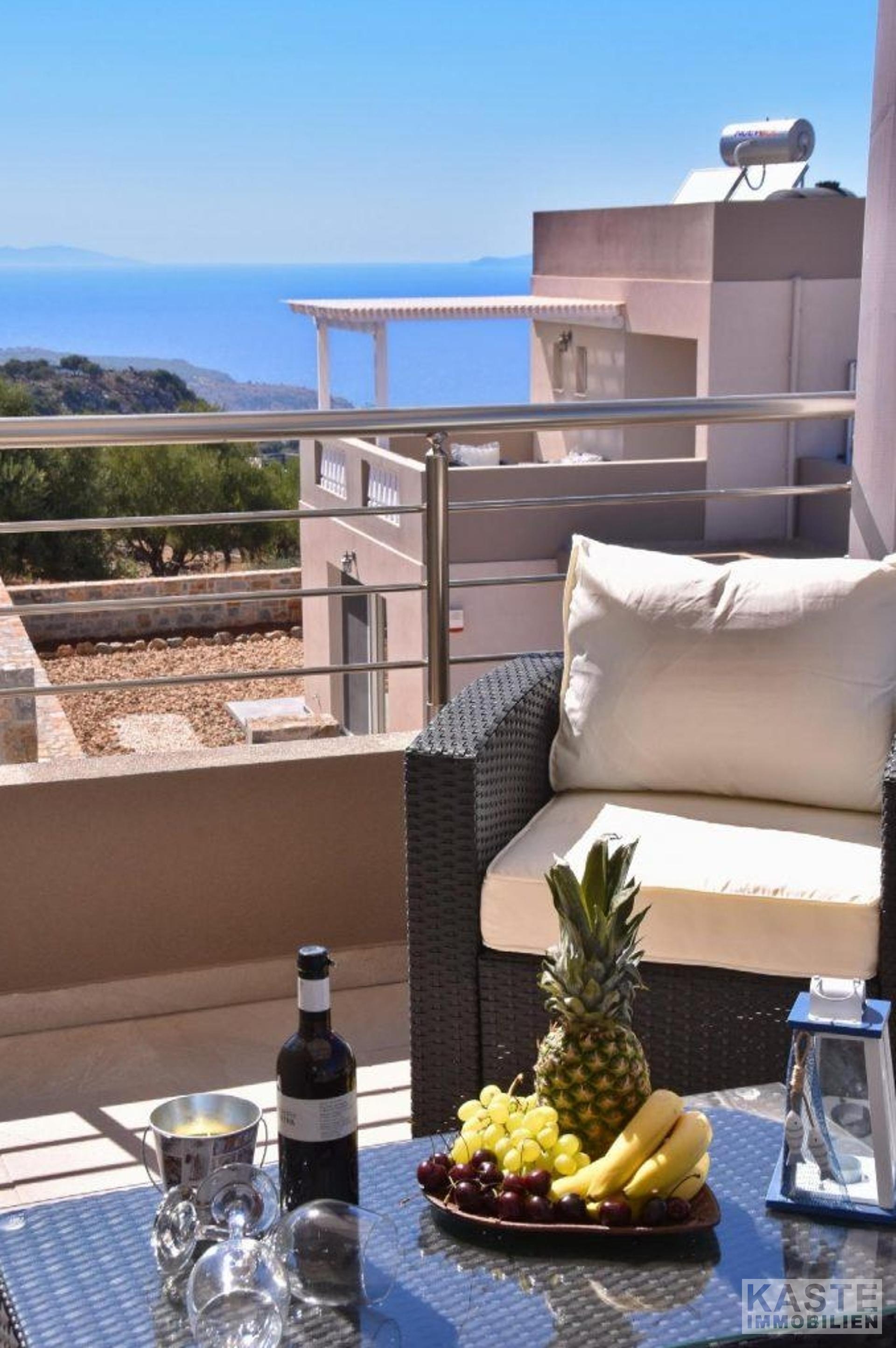 Diese Villa ist 120 m2 groß und steht auf einem privaten Grundstück von 300 m2. Im Erdgeschoss besteht sie aus einer voll ausgestatteten Designer-Küche, einem geräumigen Ess-/Wohnzimmer und einem Gäste-WC. Im ersten Stock befinden sich zwei en-suite Doppelschlafzimmer, jedes mit Zugang zu einem kleinen Balkon und einer schönen Veranda. Alle Zimmer und Balkone in der ersten Etage haben einen Blick auf das Meer und die umliegenden Berge. Energieeffiziente Klimageräte sowohl zum Kühlen als auch zum Heizen sind im ganzen Haus installiert.
