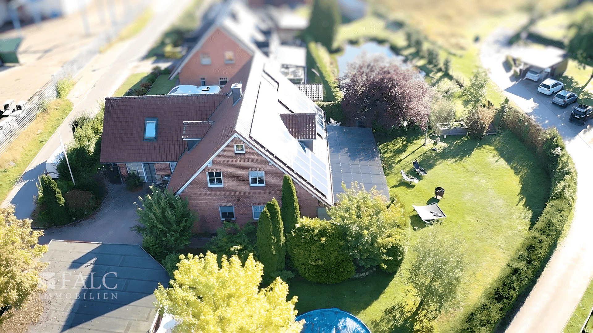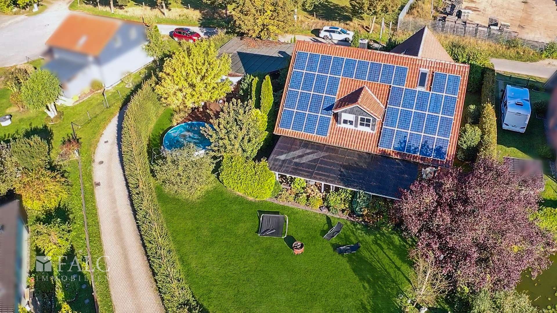 Der Außenbereich des Hauses ist ebenso beeindruckend wie das Innere. Das große, liebevoll angelegte Grundstück lädt zum Verweilen und Entspannen ein. Ein Pool mit angrenzender Lounge- und Chillecke sorgt für echte Urlaubsstimmung im eigenen Garten. Die überdachte Sonnenterrasse mit einer Fläche von ca. 40 m² bietet viel Platz für gemütliche Abende im Freien, geschützt vor Wind und Wetter. Abgerundet wird das Angebot durch ein geschlossenes Doppelcarport, das nicht nur ausreichend Platz für zwei Fahrzeuge bietet, sondern auch zusätzlichen Stauraum für Gartengeräte und Fahrräder.