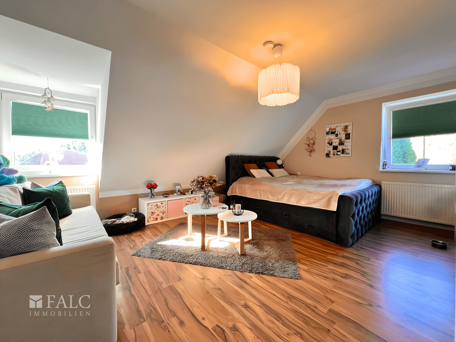 Das Obergeschoss des Hauses setzt die gehobene Ausstattung nahtlos fort. Hier befinden sich drei gut geschnittene Schlafzimmer, die alle durch ihre Helligkeit und die angenehme Größe überzeugen. Das Masterbad auf dieser Etage bietet luxuriöse Annehmlichkeiten, darunter eine große Badewanne, die zu entspannten Stunden einlädt. Ein weiteres Highlight ist das Elternschlafzimmer mit einer angrenzenden, geräumigen Ankleide. Dieser Bereich des Hauses befindet sich in einem separaten Flügel und ist über den Fitnessraum zu erreichen, was zusätzliche Privatsphäre und Ruhe bietet.