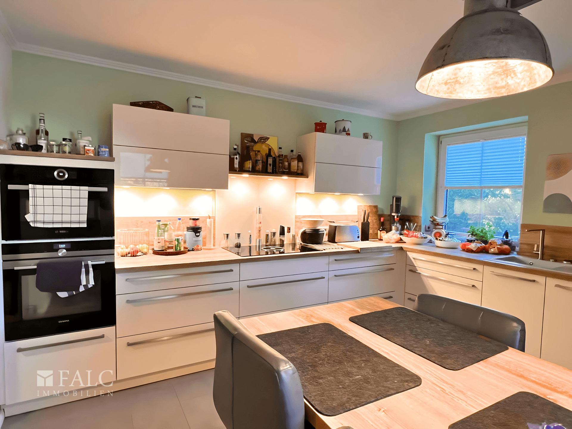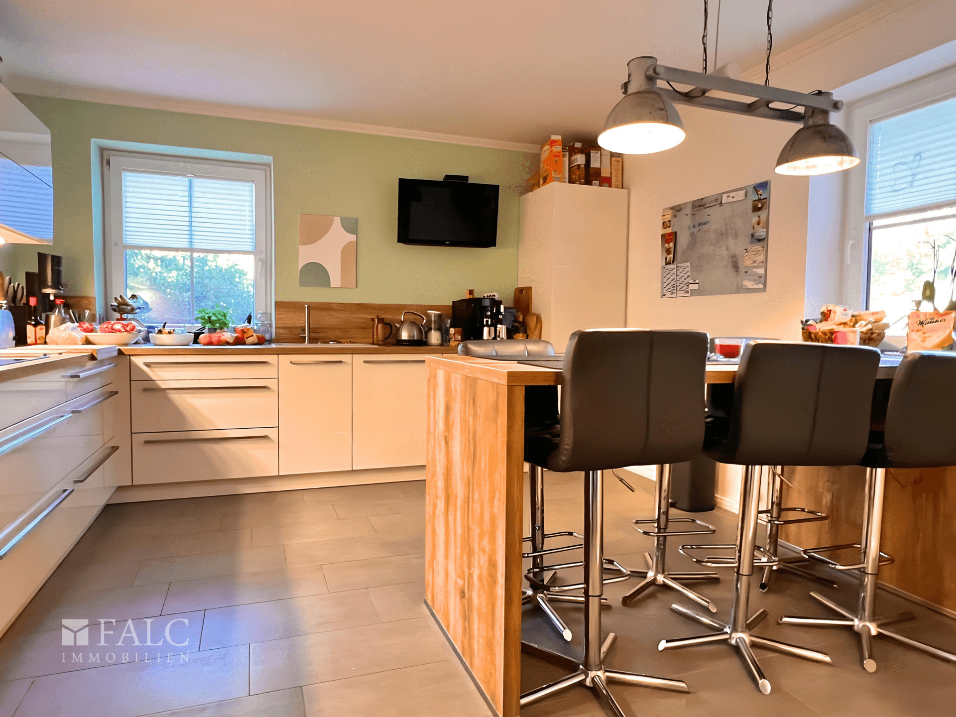 Schon beim Betreten des Hauses spürt man die großzügige und einladende Atmosphäre. Der Eingangsbereich ist weitläufig gestaltet und wird durch einen stilvollen Kamin zum Herzstück des Erdgeschosses. Er verbindet die verschiedenen Wohnbereiche auf harmonische Weise und schafft ein warmes, behagliches Ambiente. Direkt angrenzend liegt die moderne, top ausgestattete Küche, die keine Wünsche offenlässt. Hier finden Sie viel Platz zum Kochen und Genießen in einem ansprechenden und funktionalen Design. Offen gestaltet, geht die Küche in das geräumige Wohnzimmer über, das mit seinen bodentiefen Fenstern viel Licht hereinlässt und den Blick in den Garten freigibt. Von hier aus haben Sie direkten Zugang zur ca. 40 m² großen Sonnenterrasse, die perfekt für entspannte Nachmittage im Freien oder gesellige Abende mit Freunden und Familie geeignet ist.
