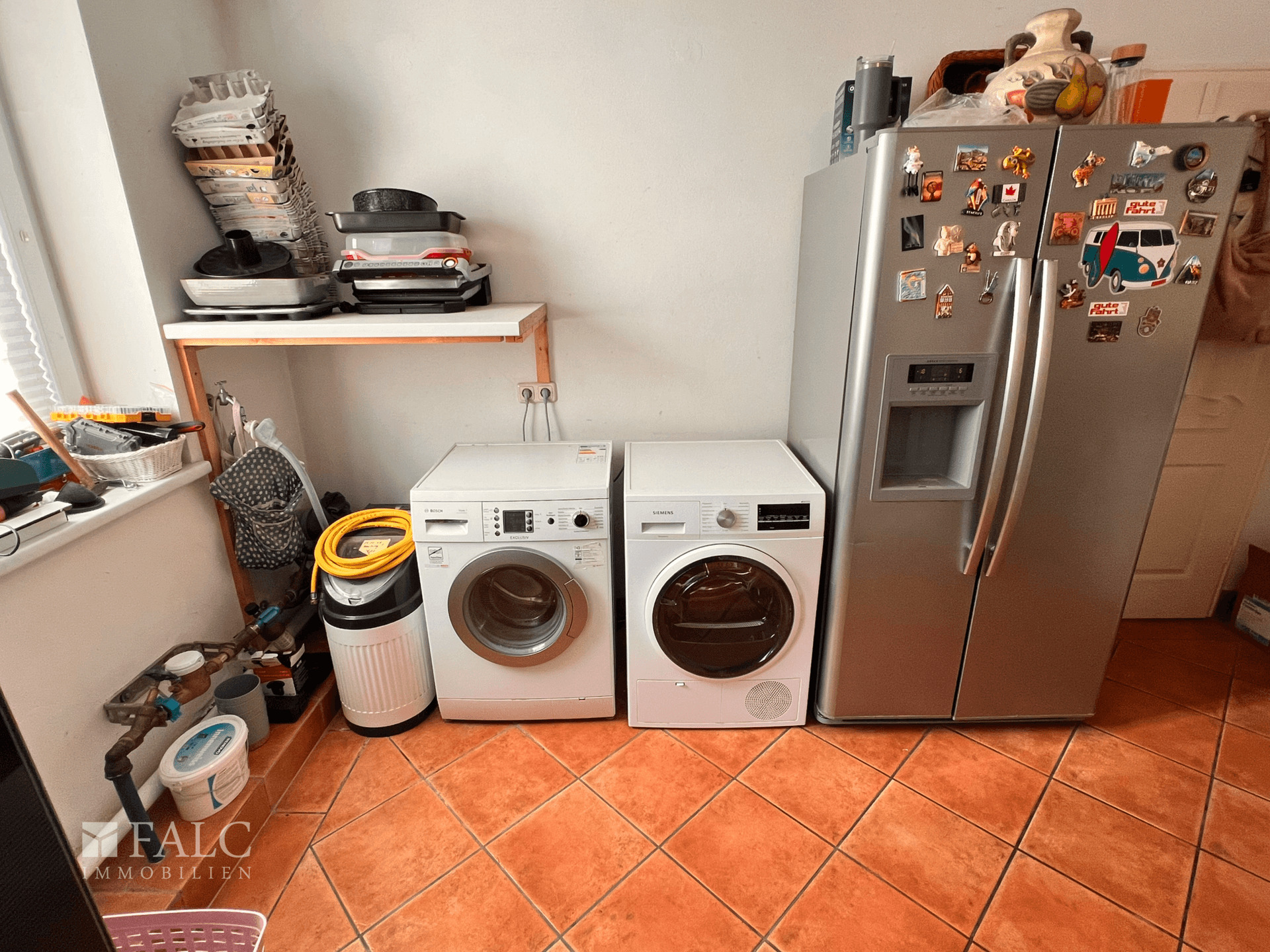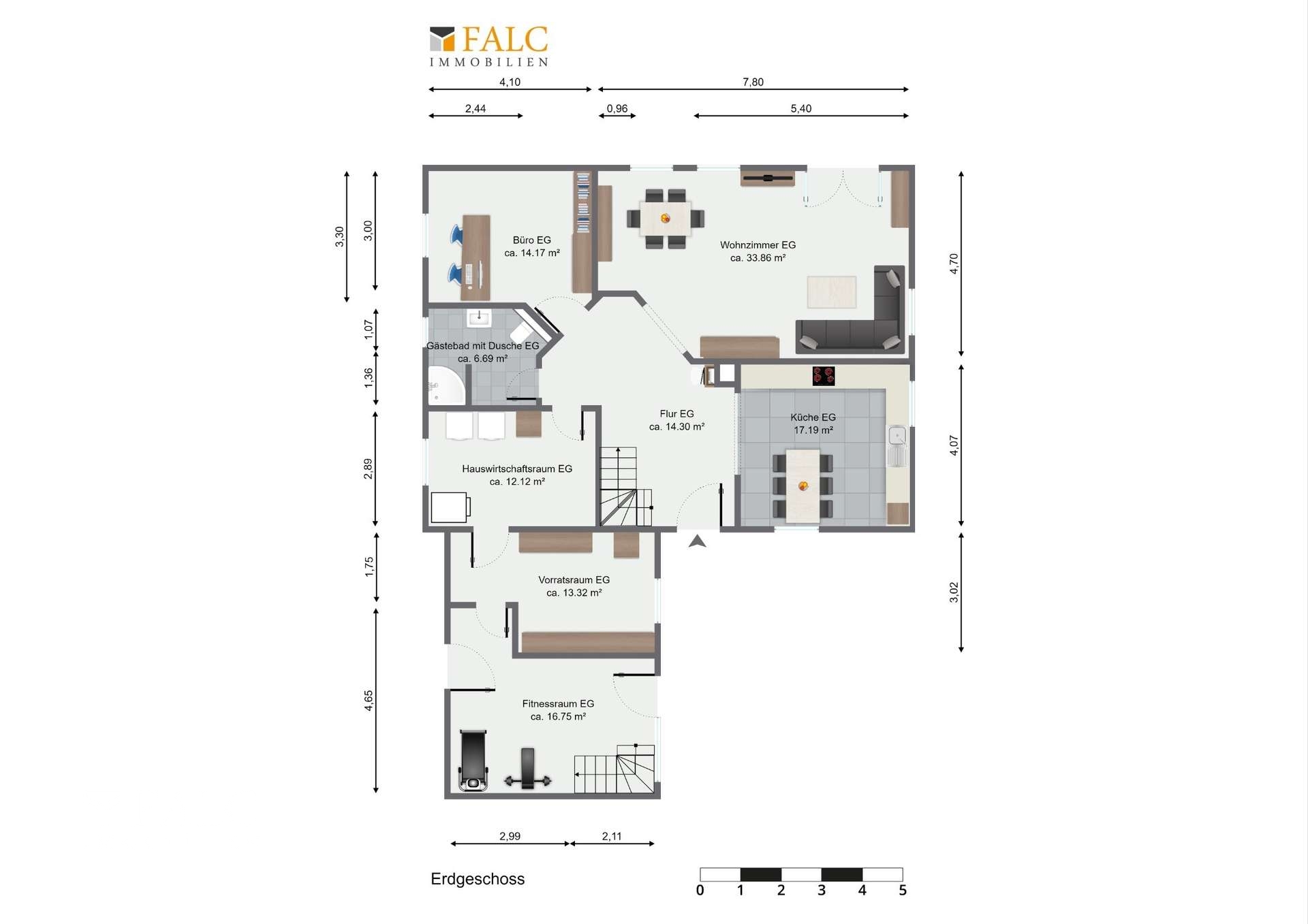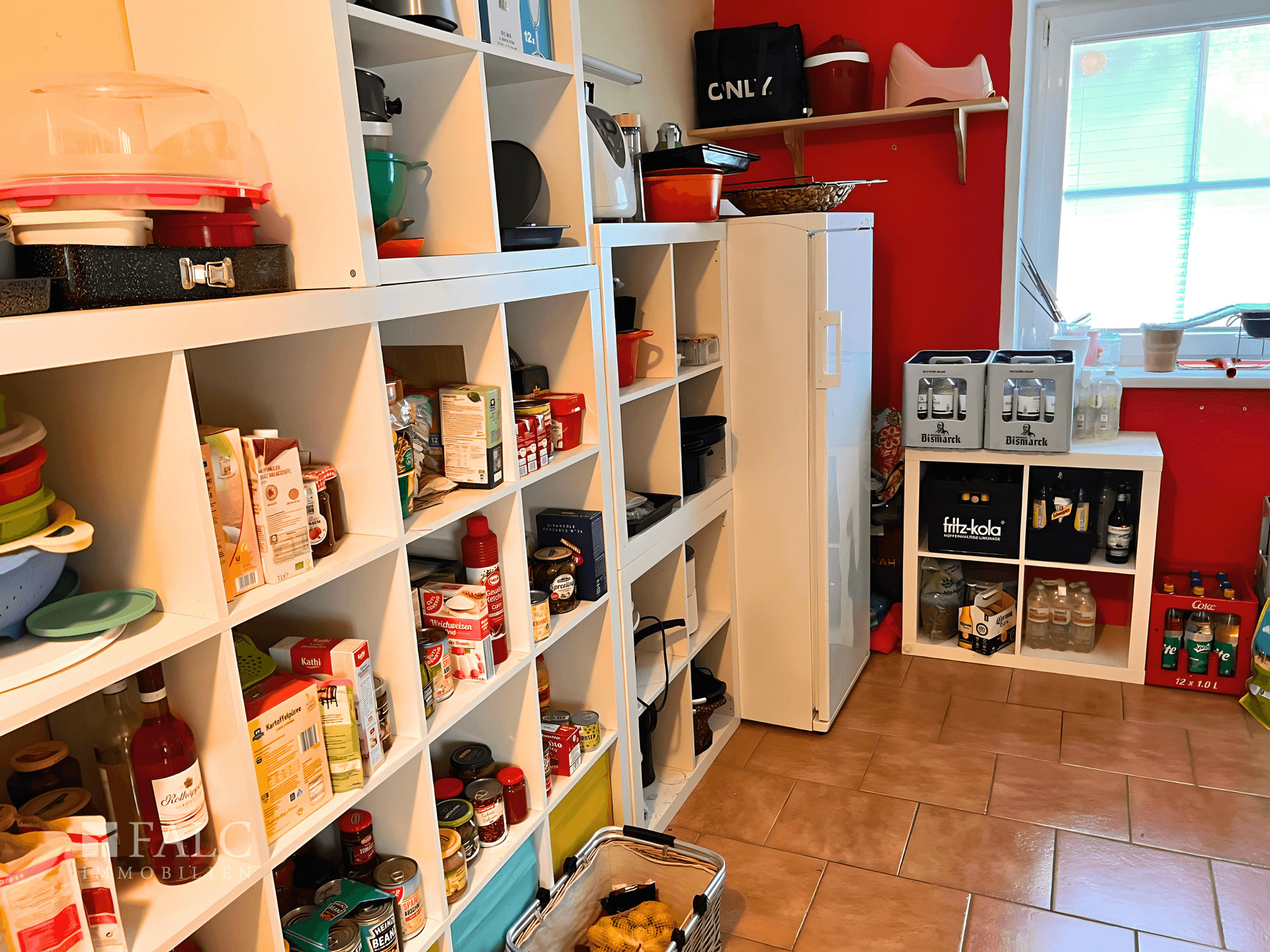 Das Erdgeschoss bietet darüber hinaus einen praktischen Hauswirtschaftsraum sowie einen Vorratsraum, der ausreichend Stauraum bietet. Ein modernes Gästebad mit Dusche sorgt für Komfort für Ihre Besucher. Für all jene, die von zu Hause aus arbeiten möchten oder ein ruhiges Refugium benötigen, steht ein helles, gut geschnittenes Büro zur Verfügung. Ein besonderes Highlight im Erdgeschoss ist der großzügige Fitnessraum, der viel Platz für sportliche Aktivitäten bietet und damit für die körperliche Erholung direkt im eigenen Zuhause sorgt.